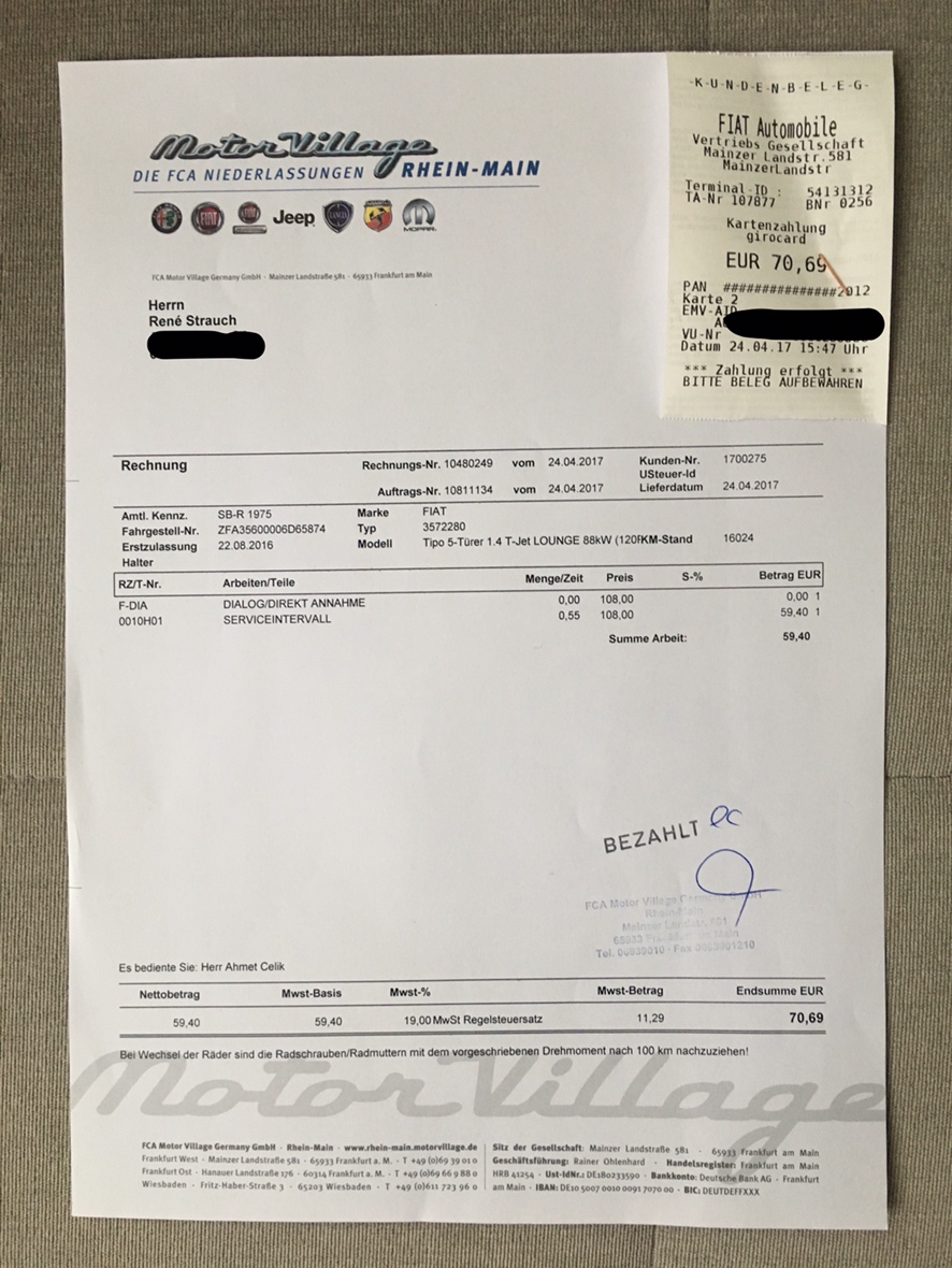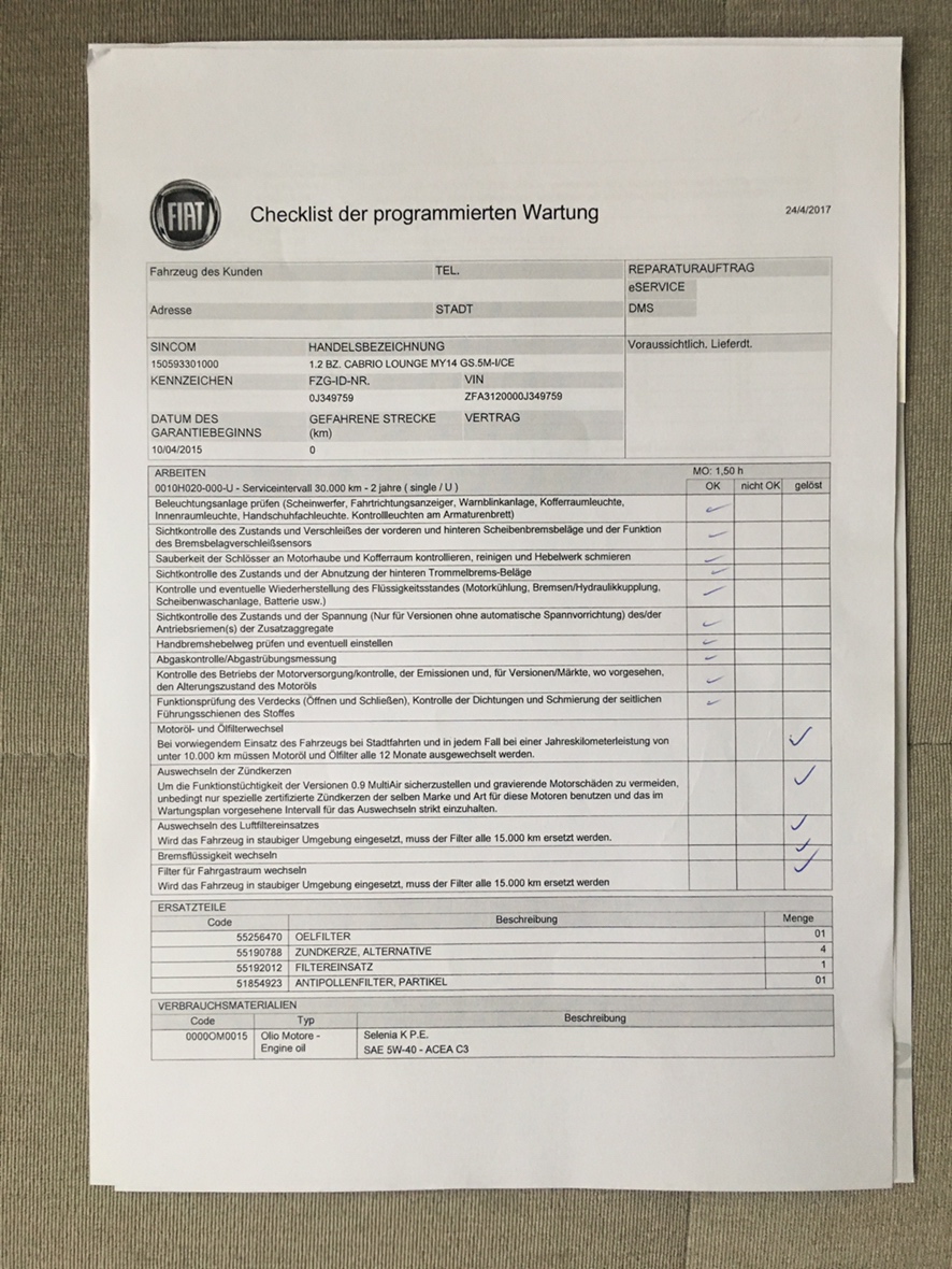 • Also die Checkliste ist nicht für den Tipo sondern ähm ja gute Frage, überlege grad was denn Sincom (=Modellschlüssel) 150 ist. Der Tipo-Sincom fängt jedenfalls mit 356 an, nicht mit 150. Aha, erwischt, da steht ja auch die Fahrgestellnummer ZFA312..... ist laut E-Per online ein Fiat 500 Cabrio Lounge MY14 (Modell/Facelift 2014) mit 1,2 Benziner. Also der Wartungsplan war nur für einen halben Tipo ;)