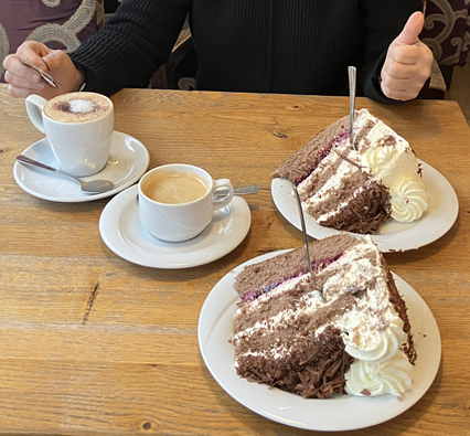 Links vom Kuchen, ja das ist keine Espresso Tasse, das Größenverhältnis stimmt.