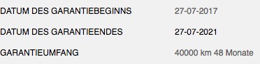 In Deutschland ist aktuell 4 Jahre und 40.000km Garantie aktuell.