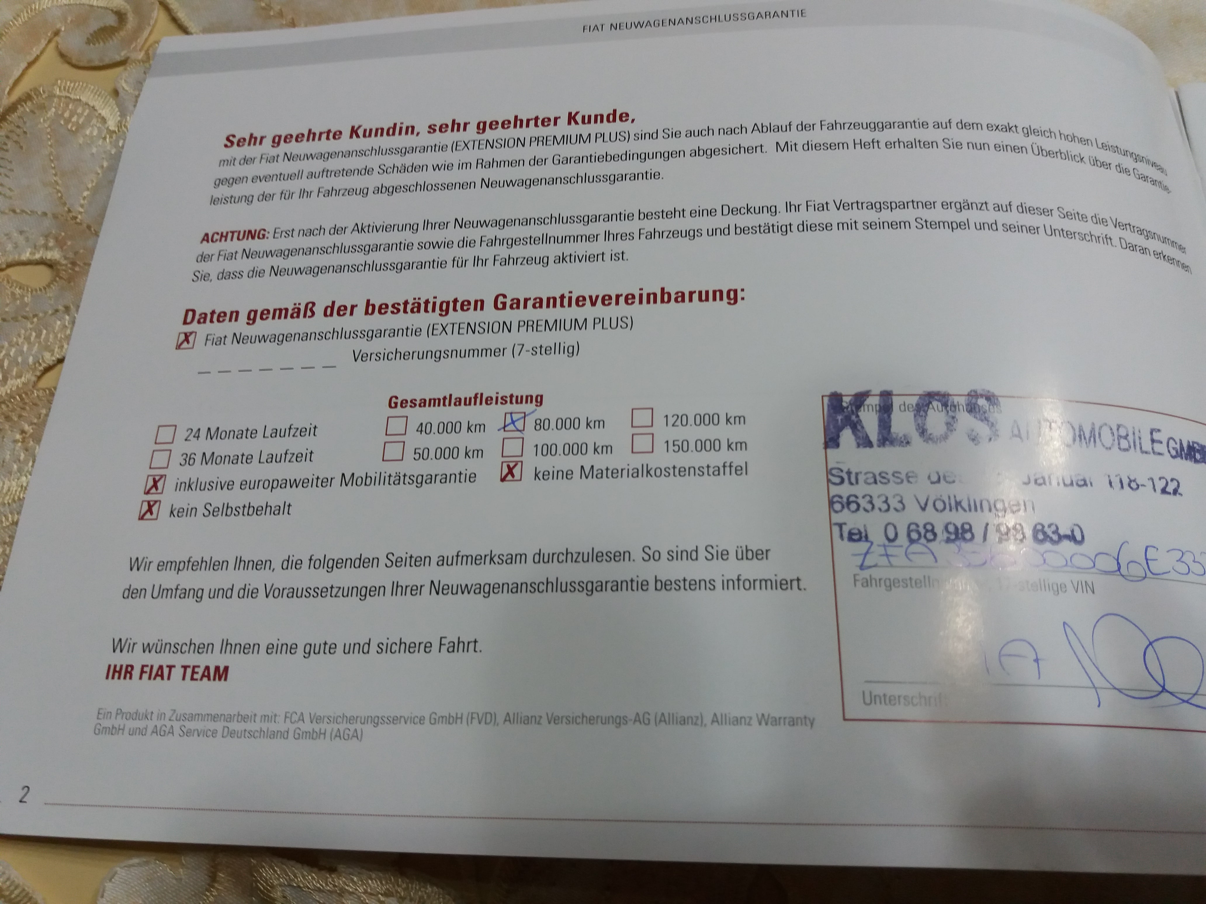 Also, nicht abwimmeln lassen, auch diejenigen die eine Tageszulassung kaufen haben 4 Jahre - 2 Jahre Neuwagen plus 2 Jahre Anschlussgarantie. Leider habe ich keinen Zugriff auf die entsprechenden Fiat-Systeme, sonst würde ich mir ein paar Fahrgestellnummern geben lassen und Euch die Daten der Verlängerung zukommen lassen. Der Fiat-Händler hier vor Ort hat ja auch die Garantieverlängerung bei meinem Tipo im System nicht gefunden... musste die Niederlassung mir ausdrucken und zusenden, jetzt habe ich diesen Ausdruck stets im Auto plus zusätzlich zu Hause in den Unterlagen. Die müssen an der richtigen Stelle suchen, kann sein das es sogar mal so mal so hinterlegt ist. Wenn die Daten in MyFiat nicht zu sehen sind (wie bei meinem) kann das wie bei mir daran liegen, das die Fg.Nr. zuvor auf jemand anderen registriert wurde und nur dem die Daten angezeigt würden; oder das der ausliefernde Händler MyFiat nicht (vernünftig/vollständig) gepflegt hat.