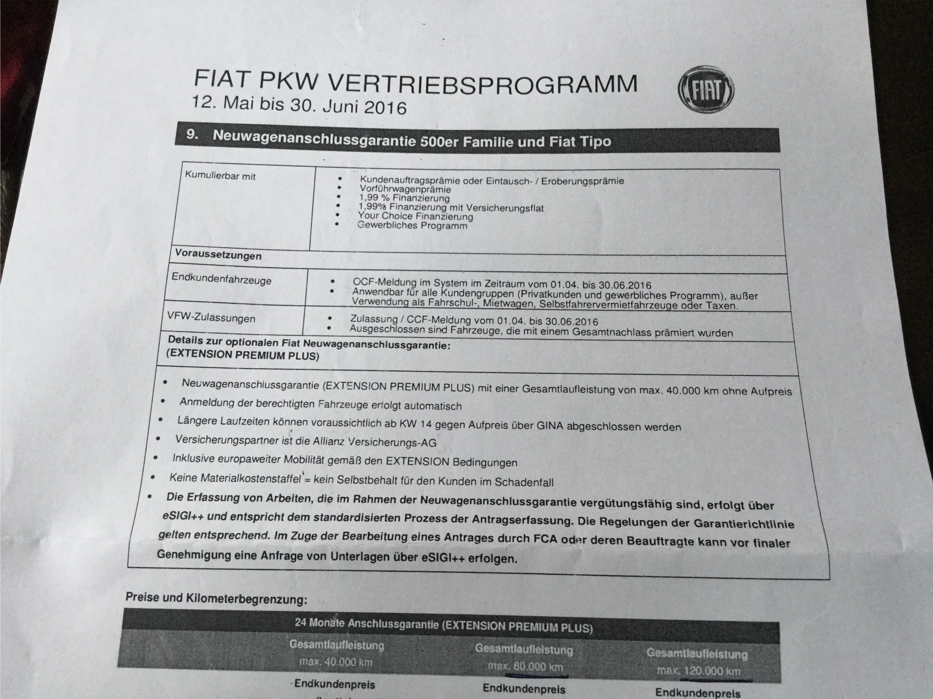 Dumm ist wenn diese NeuwagenAG für 4 Jahre mit höherer Laufleistung (80tkm) vermutlich vom Vorbesitzer abgeschlossen wurde, das aber vom verkaufenden Autohaus nicht in das Fiat-Programm (Link Entry oder so) eingegeben wurde. Weil die sollen bei Fiat wohl zu doof sein, das automatisch bei der Fahrgestellnummer zu hinterlegen wenn der Verkaufshändler das nicht eingibt steht da wohl nix.. Der Fiat-Händler hier um die Ecke hat heute online geguckt: