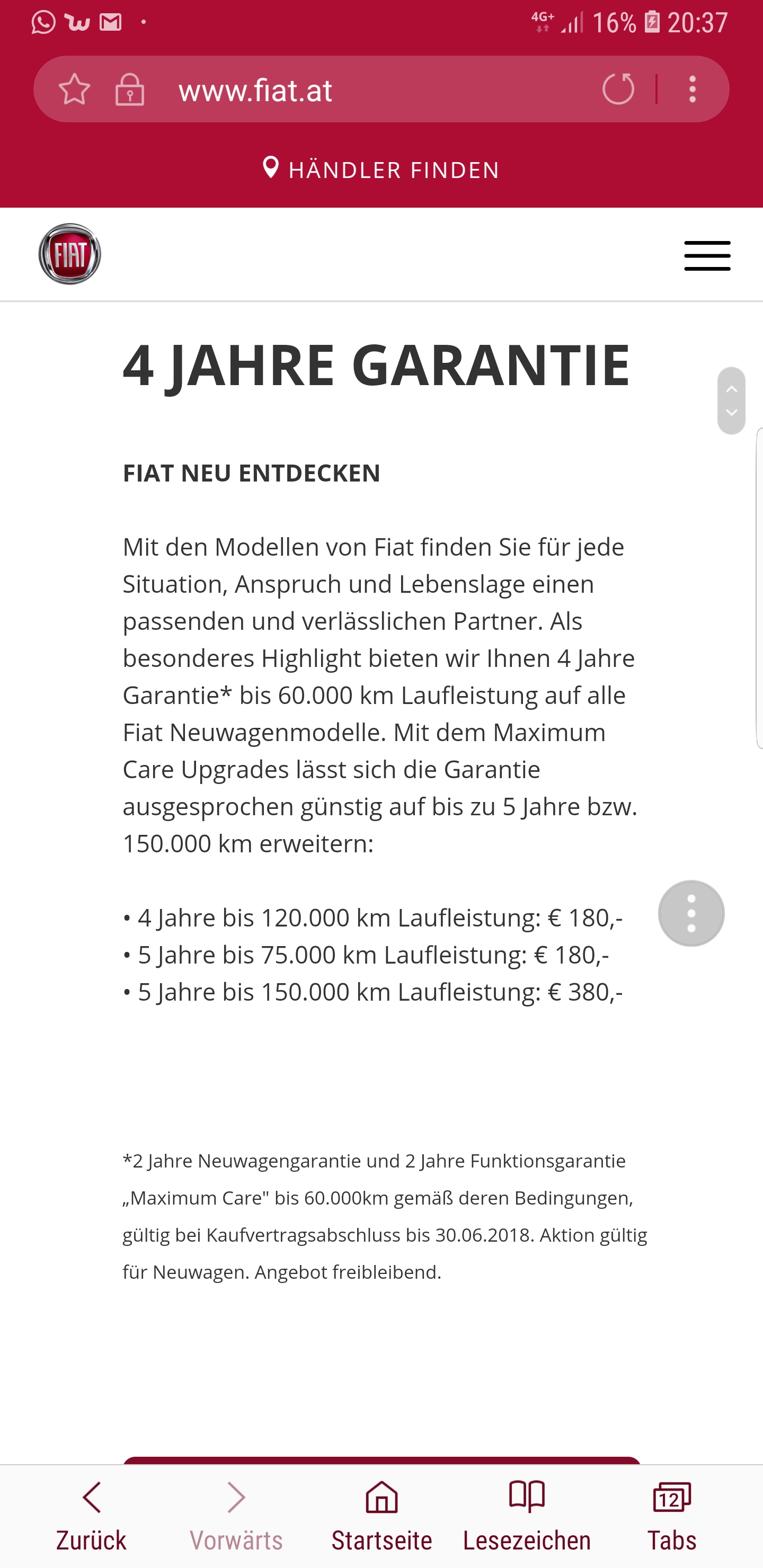 • War heute morgen um Punkt 9 Uhr bei Fiat wegen der Verlängerung der Extension Plus Garantie, die ich ja bereits beim Kauf im Juni 2016 erhalten hatte, die aber spätestens nach 40.000 km ausgelaufen wäre.