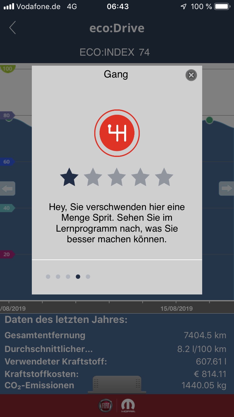 Soo hab jetzt die Testrunde von Fiat( 105km mit 6,4 im Schnitt) endlich auf dem ECO Drive ins Iphone übertragen bekommen. Vorweg, so einen schlechten Index hatte ich noch nie! die haben 65 und beim Schalten tiefrot nur 1 Stern. Jetzt frag ich mich was dieser ganze Quatsch soll, wenn ich mit Index 80 und alles grün 2 Liter mehr verbrauche?