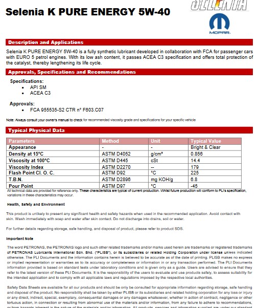 • Da ich nun ja nicht mehr sicher sein kann wann und wie viel Öl er sich genehmigt, wollte ich mal direkt nach der Spezifikation vom Selenia 5W40 für den ganz normalen 95 PS Motor anfragen. Man findet nämlich gefühlt tausende Sorten und da bin ich echt überfragt.