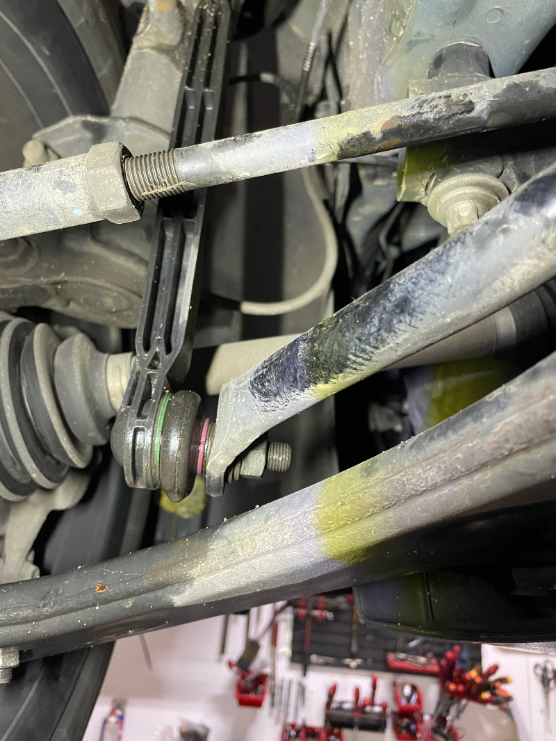 Koppelstange am Gelenk sauber und vorsichtig mit einer Flex abtrennen. Sollte am Stabi Auge Farbe ab sein das bitte wieder einsprühen wegen Rost und so. Die Mutter muss natürlich neu und sind meistens dabei.
