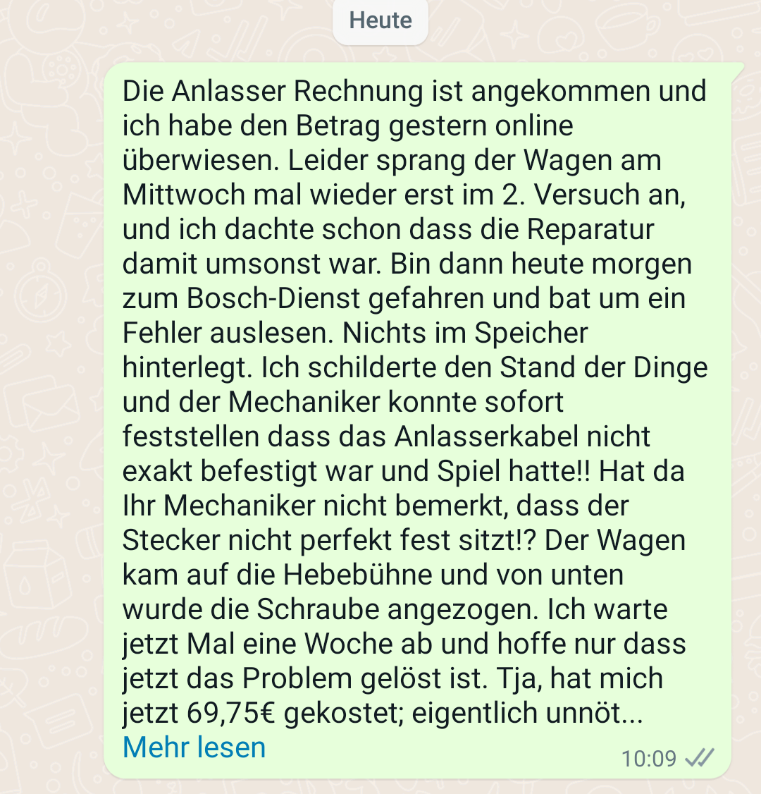 Zwischenstand zum Anlasser bzw. den Startaussetzern. Nachdem es nie in den letzten Wochen gänzlich verschwunden war, habe ich letzten Samstag im Frankenland einen neuen Boschanlasser einbauen lassen. 50€ netto Einbau, 190€ netto für das Teil.