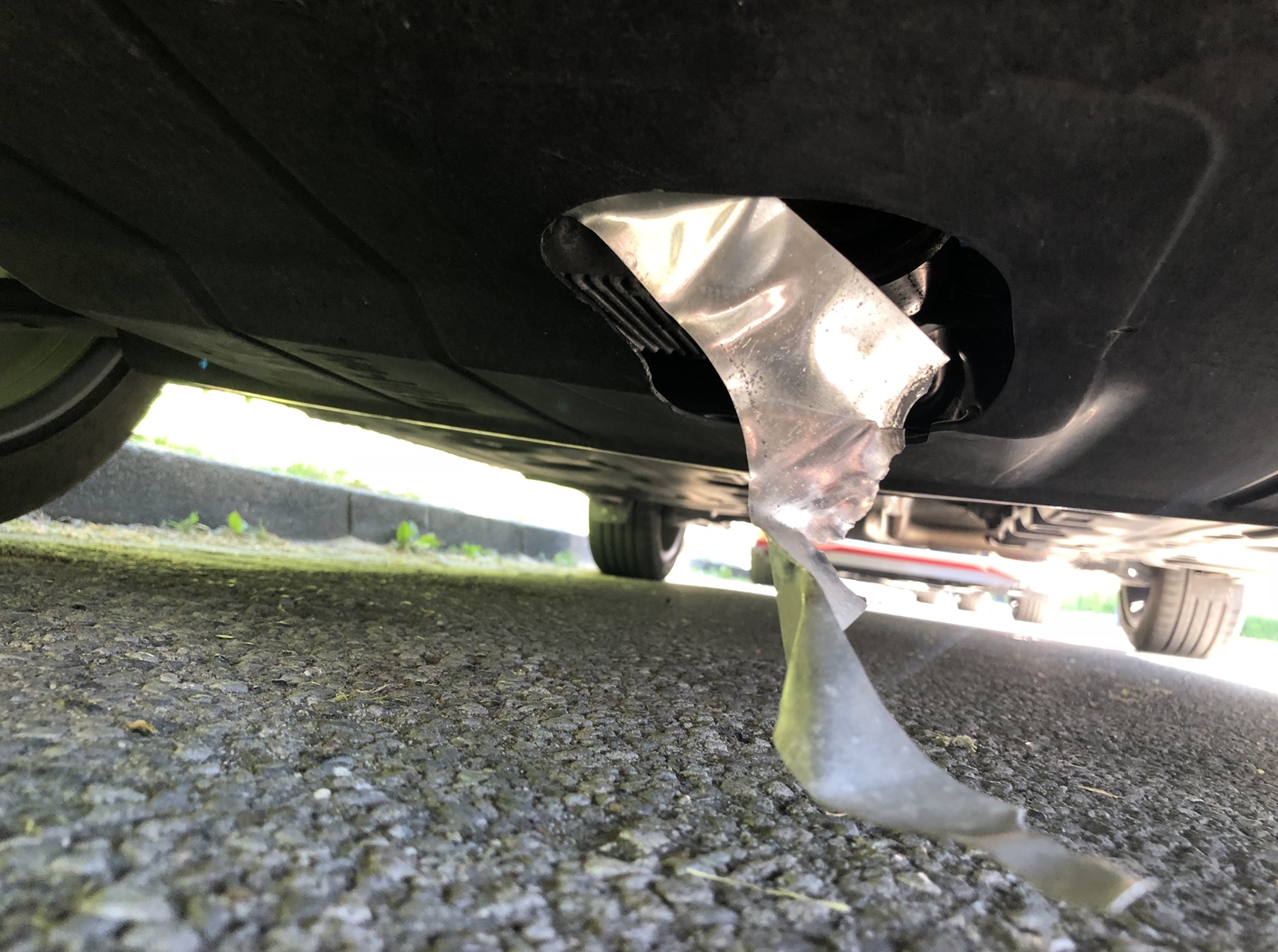 Ich habe das Stück Blech erstmal wieder notdürftig in das Loch gefrickelt, da ich es nicht komplett entfernen kann und damit es auch nicht auf der Straße schleift.