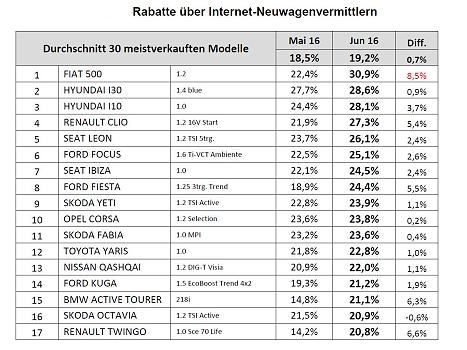 Besonders hoch ist der Verkaufsdruck offenbar bei Fiat. "Der Fiat 500 ist in der Basisversion als individuell ausgestatteter Neuwagen – also keine Lagerware - mit knapp 31 Prozent angeboten worden. Das waren 8,5 Prozent mehr Rabatt als noch im Juni. Fiat hat also mit hohen Rabatten seine Zulassungszahlen im Juli (plus 12,9 Prozent Neuzulassungen bei einem Marktrückgang von minus 3,9 Prozent) 'gekauft'", so Dudenhöffer. Den absolut höchsten Rabatt-Wert (36,3 Prozent) kann allerdings Peugeot für sich verbuchen. Den Kleinwagen 208 gibt es bei mit einem Nachlass von mehr als 5000 Euro.Aber auch deutsche Hersteller zünden Rabatt-Feuerwerke - so zum Beispiel BMW für den 2er Active Tourer . Immerhin 21 Prozent Nachlasse kann man über Internet-Vermittler bekommen. Bei Hyundai sind es fast 30 Prozent für den Golf-Gegner i30 und den Kleinwagen i10. Dudenhöffers Fazit fällt ernüchternd aus: "Obwohl der deutsche europäische Automarkt in den ersten sieben Monaten mit guten Steigerungsraten bei den Zulassungen aufwartet, überbieten sich die Autobauer mit Rabatten. scheinen in gesättigten Märkten wie Deutschland nur noch mit hohen Nachlässen ihre Käufer zu finden." Die Käufer seien durch die jahrelangen Rabattschlachten auf günstige Preise regelrecht "trainiert" worden.