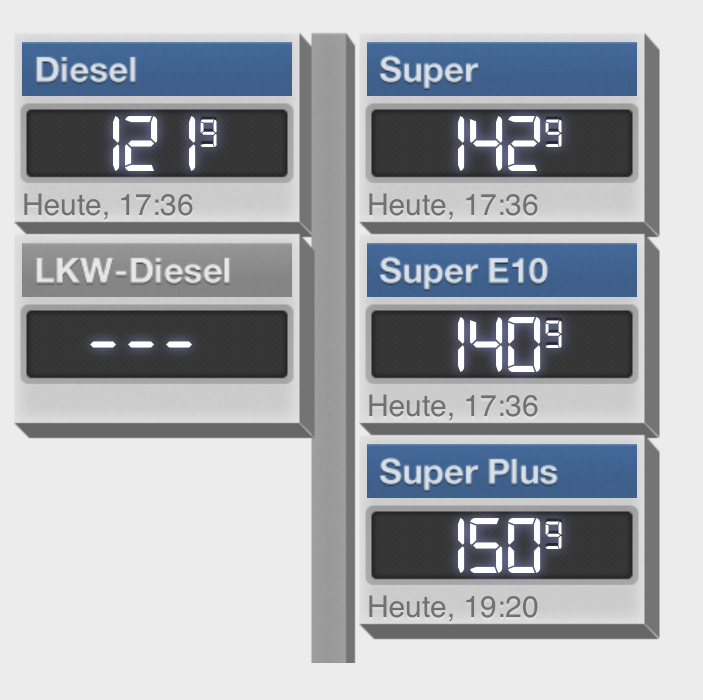 Heute an der Esso vorbeigefahren. 1,38 fürs Diesel. Aber noch sind wir vom Preis von 2012 mit 1,54 Diesel weit entfernt.