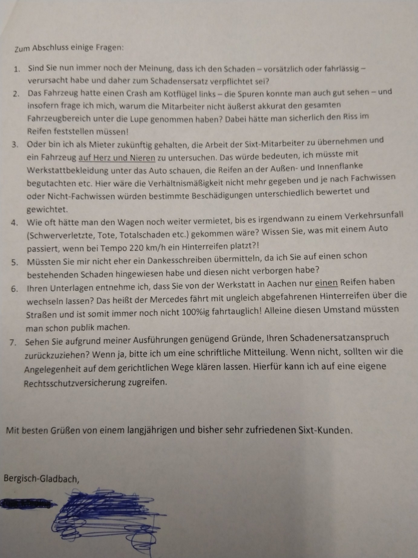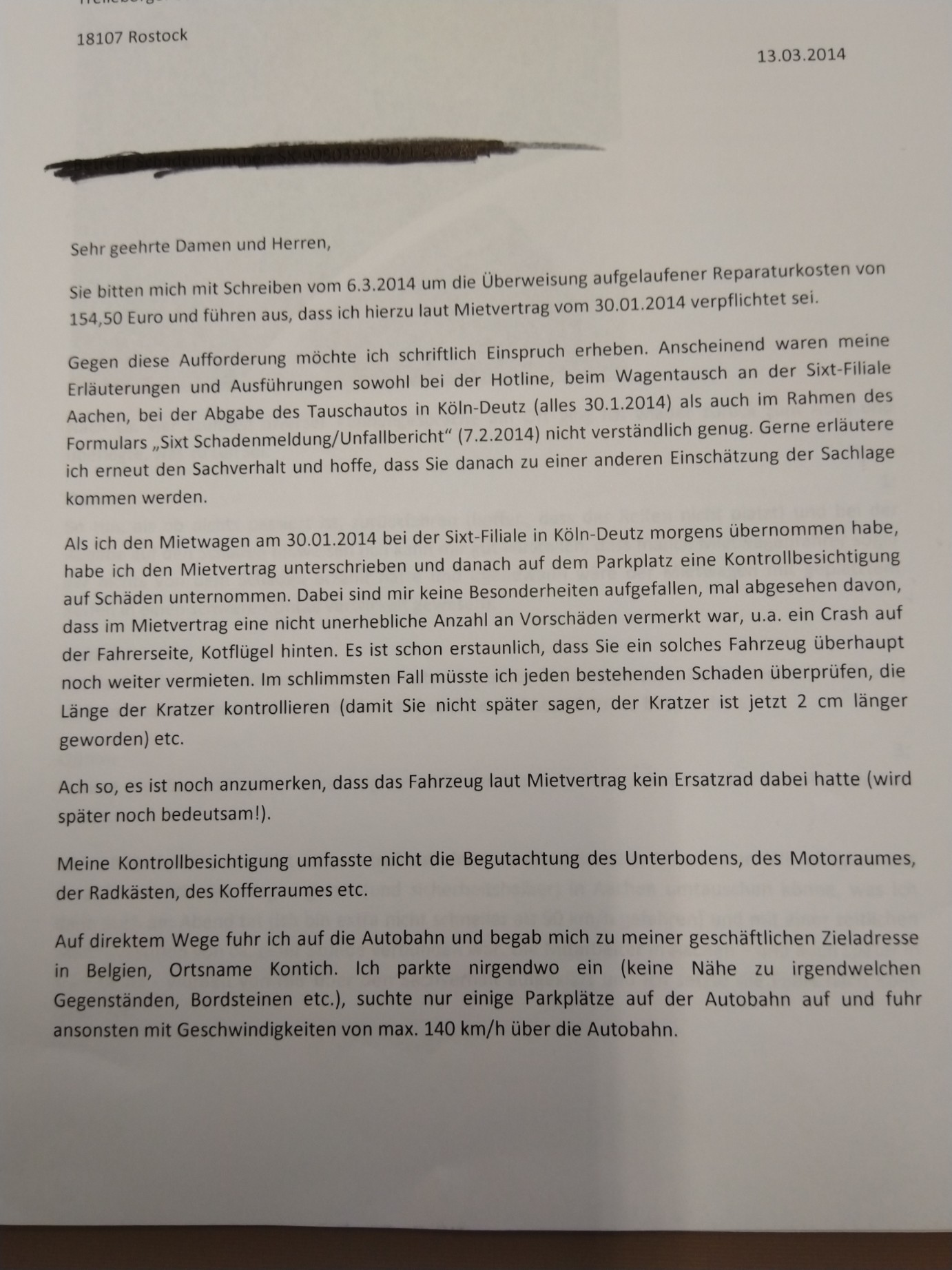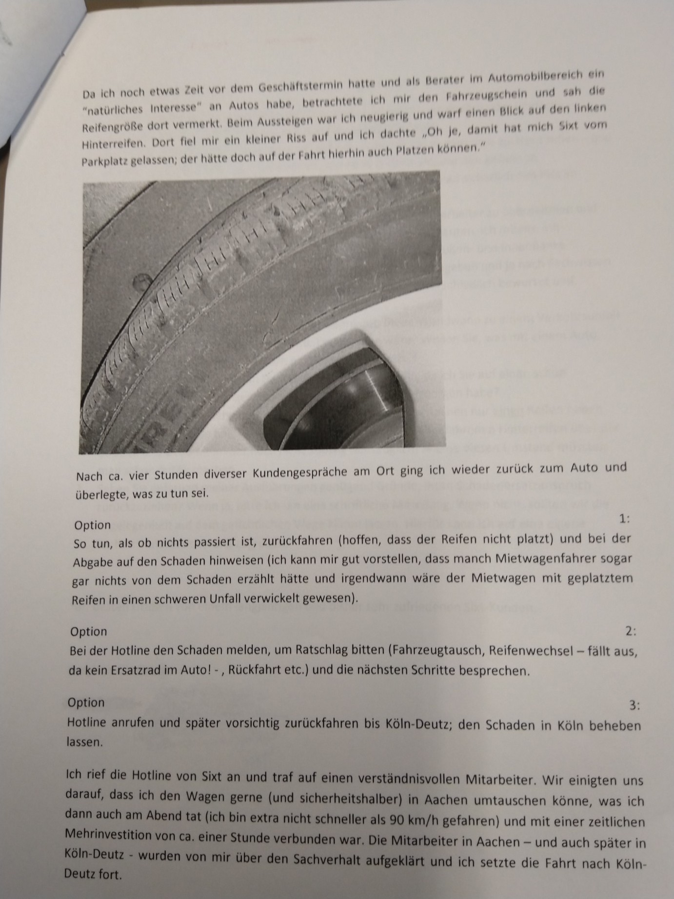 • Bin beim Aufräumen auf einen alten Schriftverkehr mit Sixt aus dem Jahre 2014 gestoßen. Die haben mich damals mit einem Riss im Reifen auf die Strecke geschickt, ich habe es entdeckt und hinterher sollte ich noch für den Schaden aufkommen.
