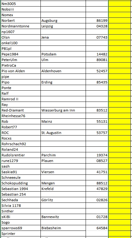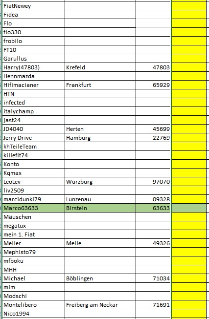 Zur Info: die PLZ Angaben können vom Mitglied kommen, ansonsten über Ortsangaben/Kennzeichen sowie wikipedia Recherche. Beispiel: jemand kommt aus Berlin und ich nehme eine x-beliebige Berliner Postleitzahl. So genau muss unsere Karte auch nicht sein.