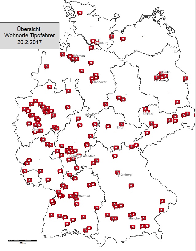 "Meine" Karten stammen aus fleißiger Beobachtung hier und intensiven Kontakten plus Infos der Mitglieder. Ich schreibe z.B. neue Mitglieder direkt an, schaue mir Kennzeichen auf den Autobildern an, suche mir bei reinen Ortsangaben (z.B. Berlin) eine willkürliche PLZ der Stadt u.v.m. Das kommt alles in ein Geomappingprogramm (tlws. habe ich google maps verwendet) und voila, fertig ist die Karte.