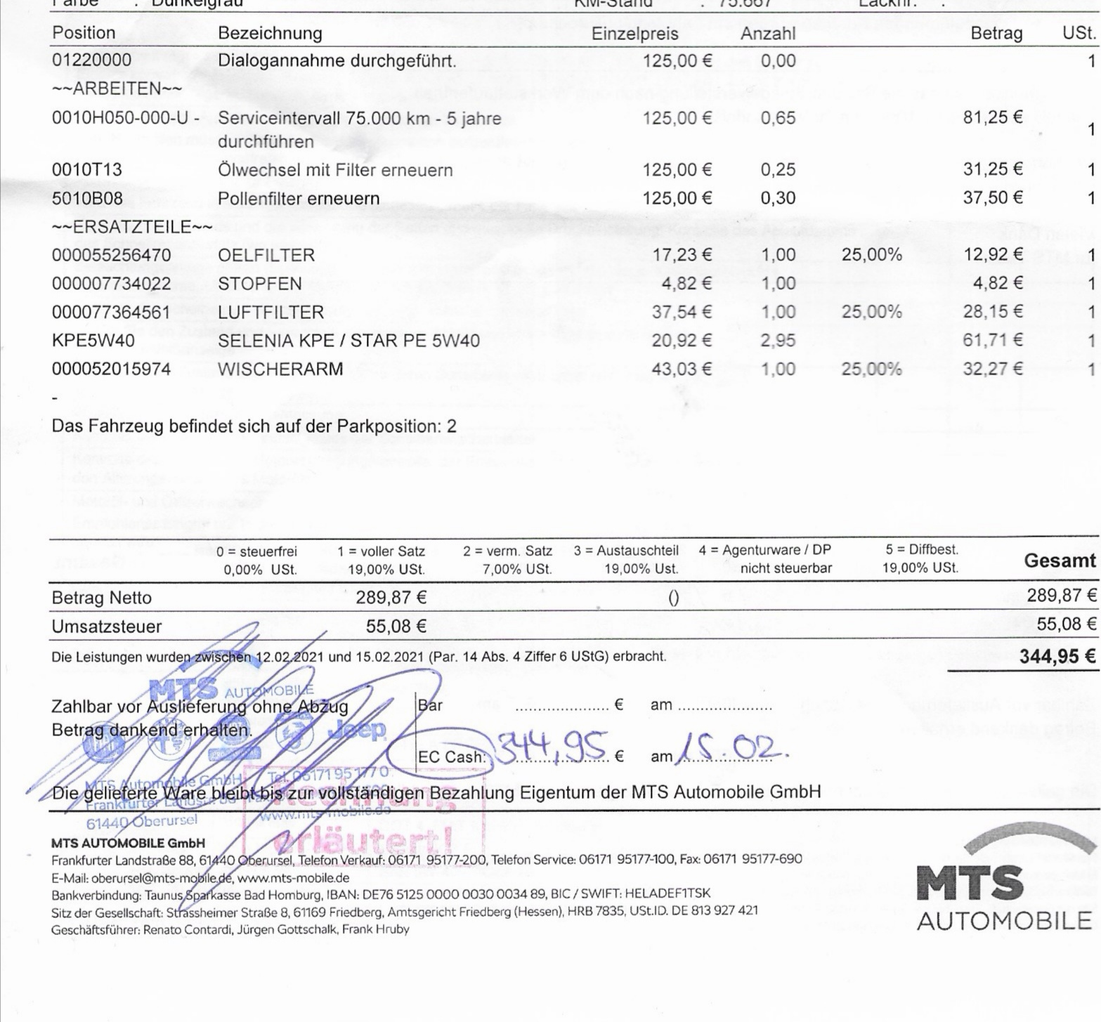 • Der 75000 km Inspektion hat €344,95 gekostet. Allerdings war da der Hinteren Wischerarm mit dabei. Ich habe auch 2 Gutscheine abgegeben wo ich jeweils 25% Rabatt auf Filter und Scheibenwischer bekommen habe. Preis geht in Ordnung finde ich.