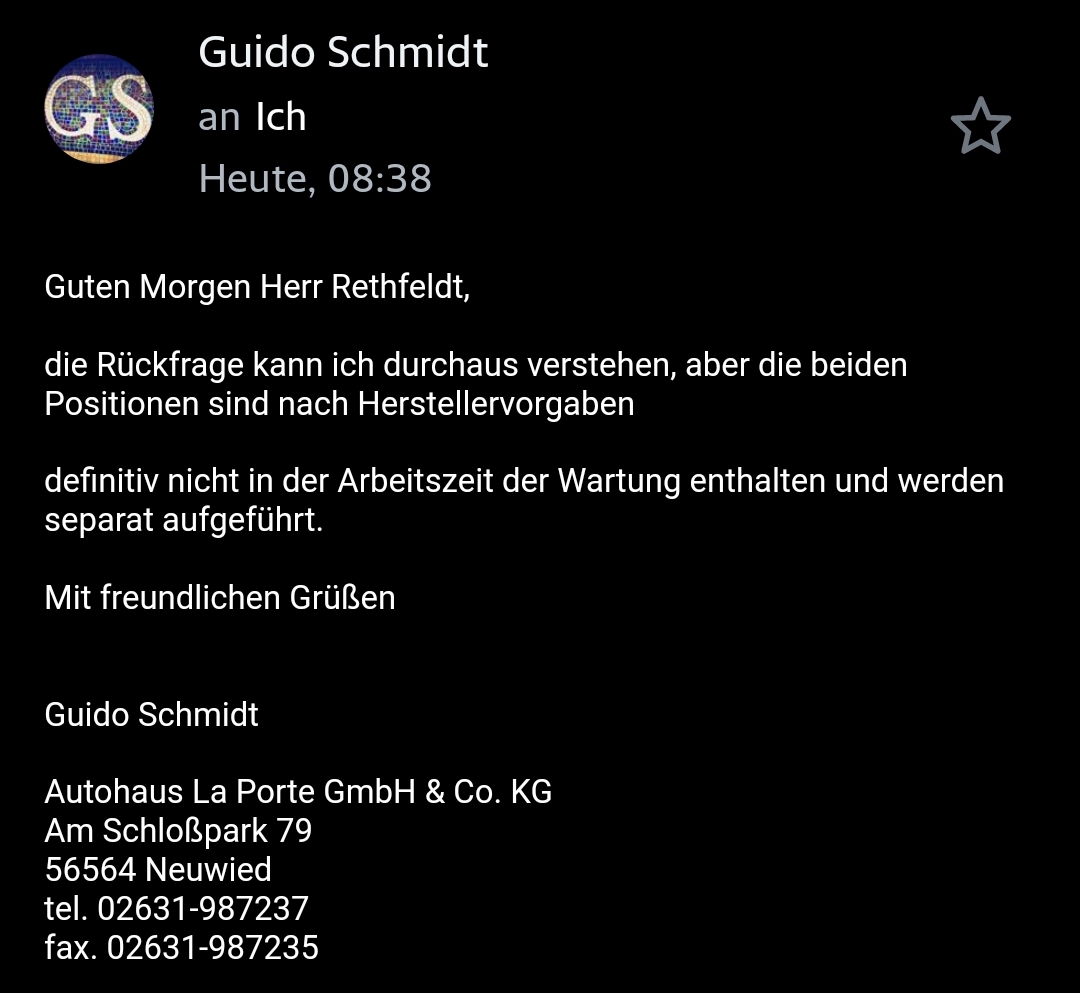 Stundensatz ist geringer dort. Aber die Ersatzteile/ Verbrauchsmaterialien sind teurer. Auch wenn ich die 10% Rabatt bekommen würde.