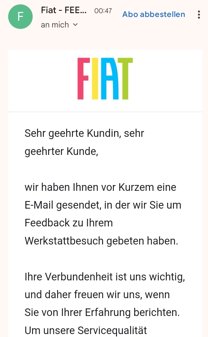 bei mir auch auf der Rechnung vom Händler….eventuell meldet sich Fiat….bitte um 5 🌟…..Fiat hatte sich aber noch nie gemeldet 😉