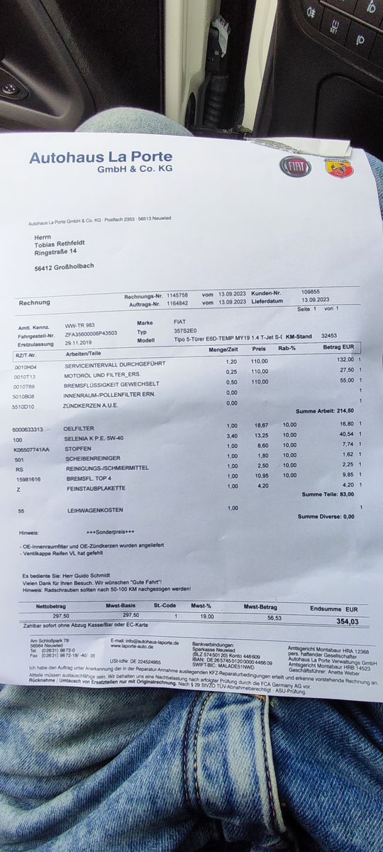 Original Zündkerzen und Innenraumfilter (Aktivkohle) habe ich selber gekauft und mitgebracht. Und Luftfilter wird bei mir nicht getauscht, da Sportluftfilter. Der steht deswegen nicht mit drauf und es wurden 0,25 Arbeitsstunden deswegen vom Service abgezogen.