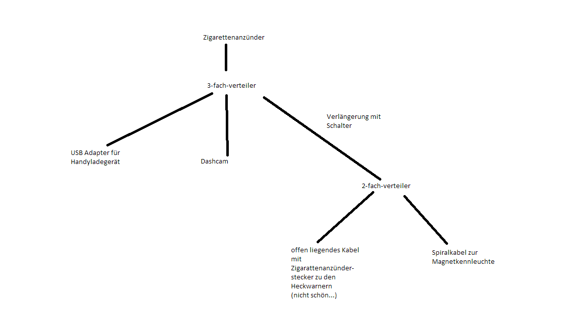 Ich habe berufsbedingt (aber auch zur Absicherung im Notfall) fest eingebaute Heckblitzer und eine Magnetkennleuchte (aktuell Zigarattenanzünder-Stecker), die ich gerne mit nem Schalter neben dem Warnblinker an- und ausschalten wollen würde. Aktuell sieht das so aus, was keine schöne Lösung ist. ![]()