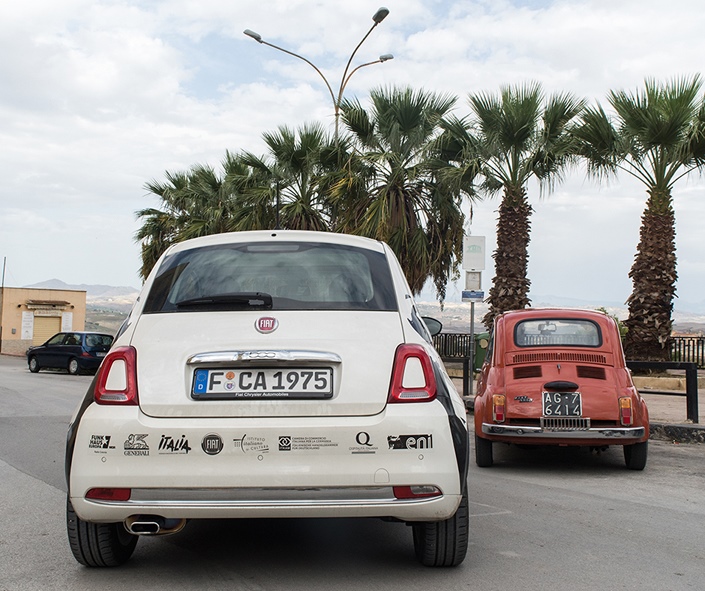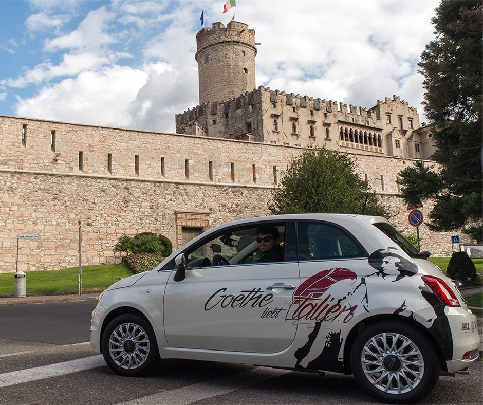 Vorlage für die kulturelle Ausfahrt war das vor 200 Jahren veröffentlichte Buch „Italienische Reise" von Johann Wolfgang von Goethe (1749-1832), das zu den bekanntesten Reiseerzählungen der Literaturgeschichte gehört. Mit dem Fiat 500, den Goethes Konterfei sowie der Schriftzug „Goethe liebt Italien" schmückte, entdeckten Laura Droße und Andrea D'Addio auf ihrer Tour die Regionen um Trient, Verona, Venedig, Bologna, Rom, Neapel, Palermo, Agrigento und Catania.