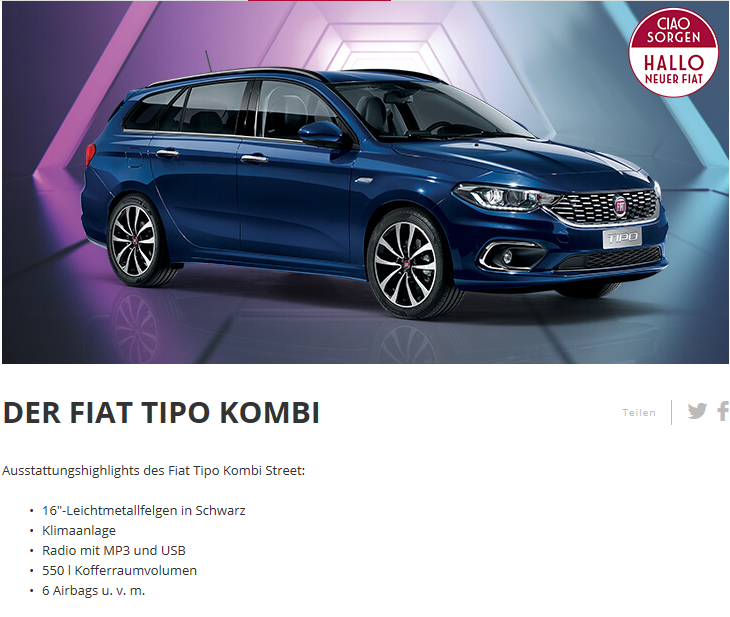 | 48 STUNDEN MIT DEM FIAT TIPO Eine Familie, die man sich aussuchen kann: Die Fiat Tipo Familie! Welches Modell es Ihnen auch angetan hat – Sie können es jetzt zwei Tage lang Probe fahren! Testen Sie die Fiat Tipo Limousine, den Fiat Tipo 5-Türer oder den Fiat Tipo Kombi ganze 48 Stunden lang und unternehmen Sie mal wieder das, worauf Sie schon lange Lust haben |