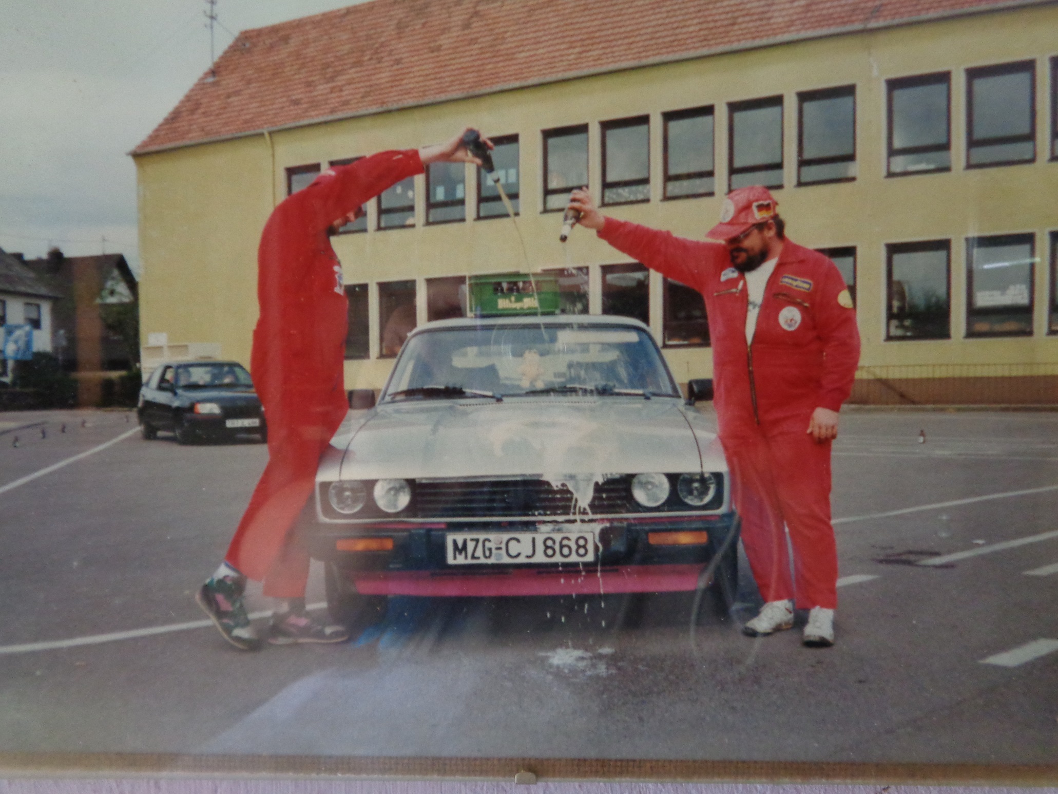Das war Anfang der 90er als ich (rechts) mit meinem besten Kumpel (beide im "Bölkstoff-Team"-Overall) meinen Capri III 2,3S auf den Namen "Wärnär" tauften... :thumbup: :thumbup: ;)