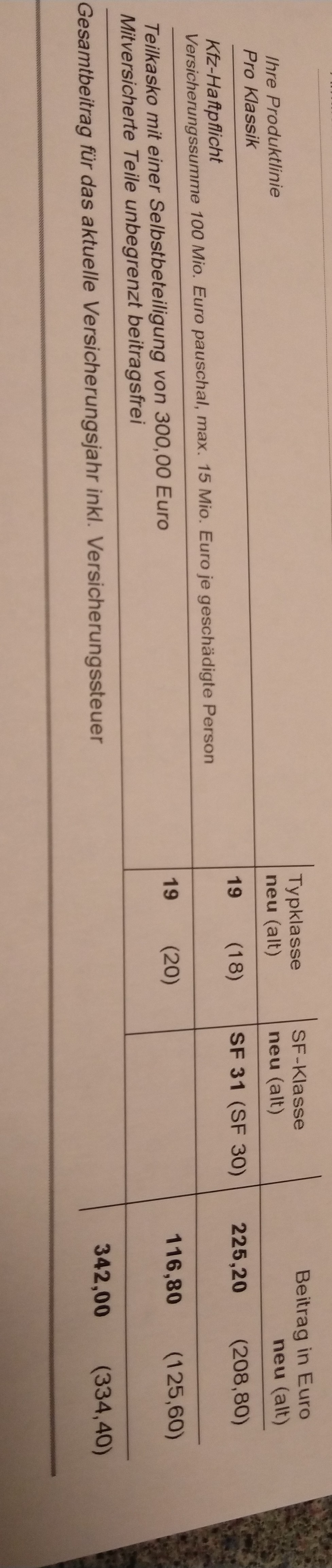 So, ein Jahr herum und Verti ruft für meine Limousine ab Juli leicht erhöhte Preise in der Haftpflicht auf (alte Typklasse 19; neue Klasse 20) und leicht reduzierte Beträge in der TK auf (alte Typklasse 19; neue Klasse 17).