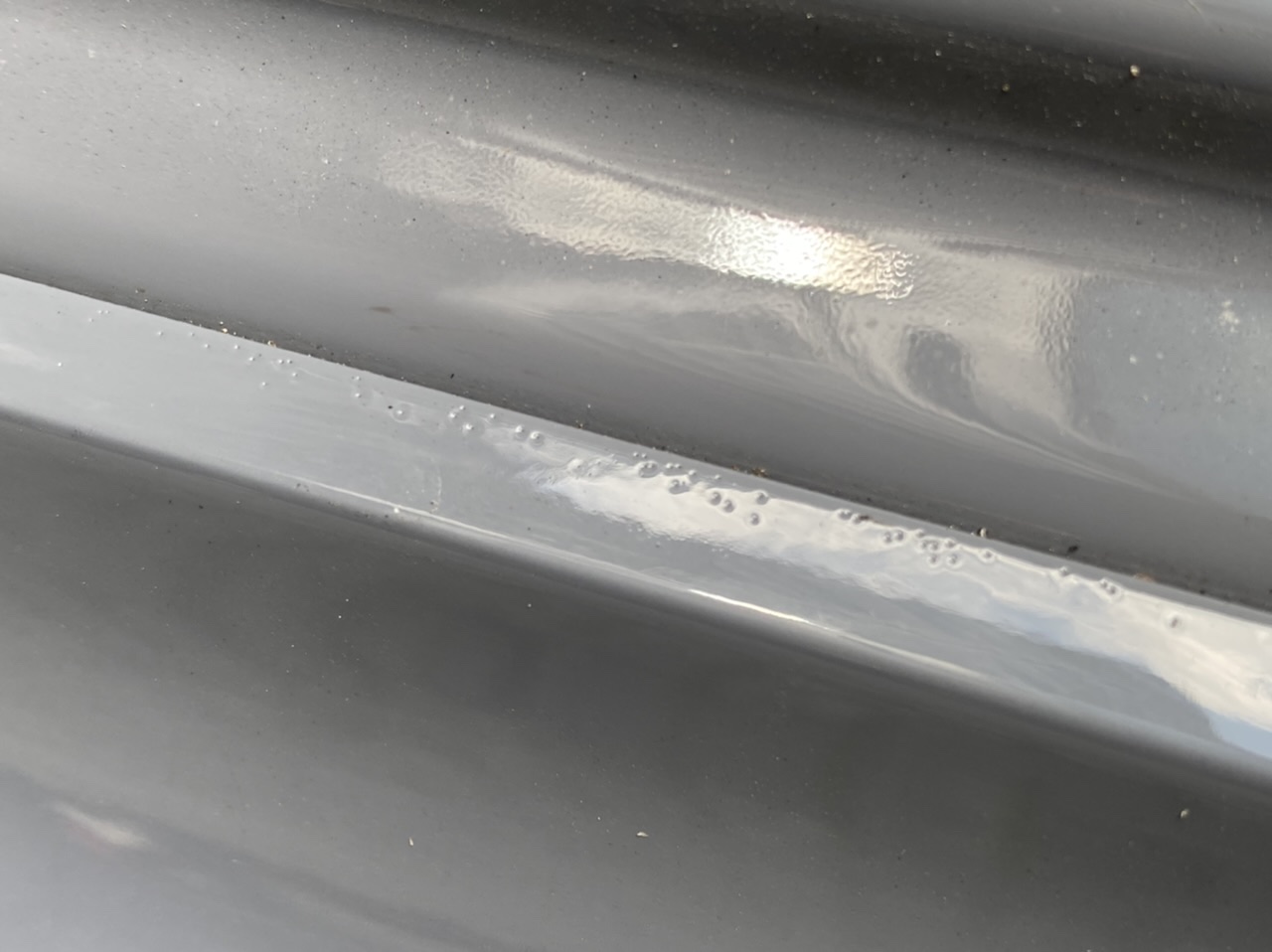 So wie ich das sehe, sind das Silikonkrater. Wenn es nur die eine Stelle ist, kannman es anschleifen, ausspachteln und beilackieren. Ich denke ich weiß wovon ich