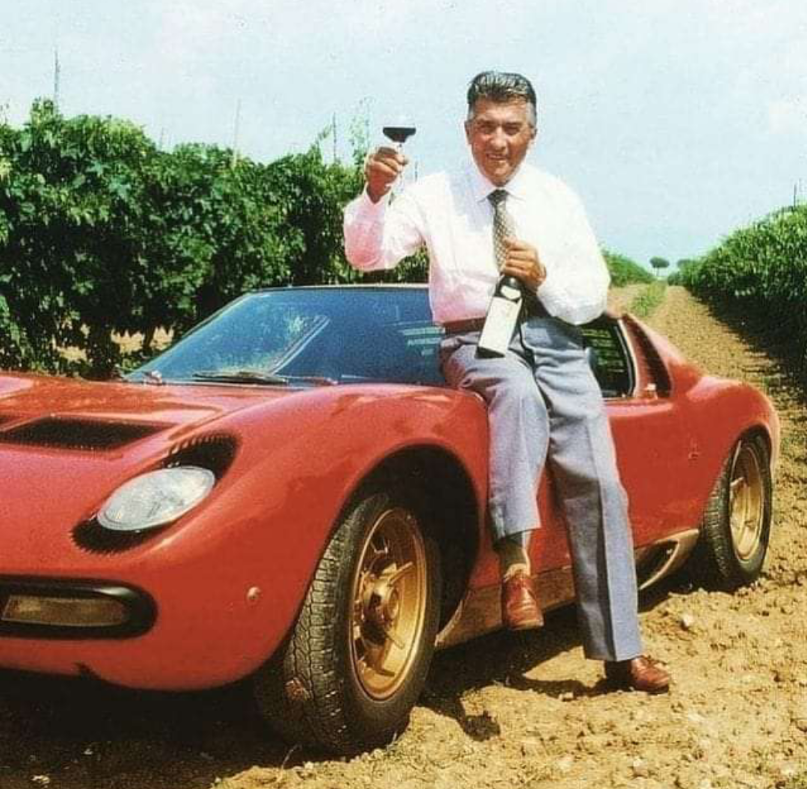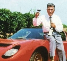 Den Weintrinker kenne ich nicht. Das Auto ist ein Lamborghini Miura aus dem Jahr 1966.