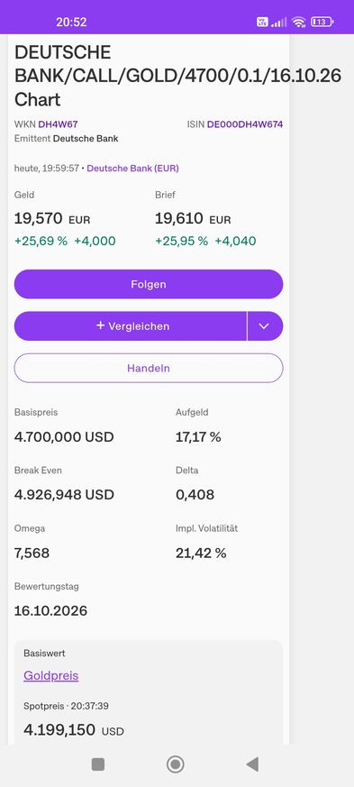 • Das Gegenstück wäre dann die Calloption. Heute schon ein sattes Plus, obwohl der Goldkurs "nur" um 1,4% gestiegen ist. Das ist der berühmte Hebel bei Optionen.