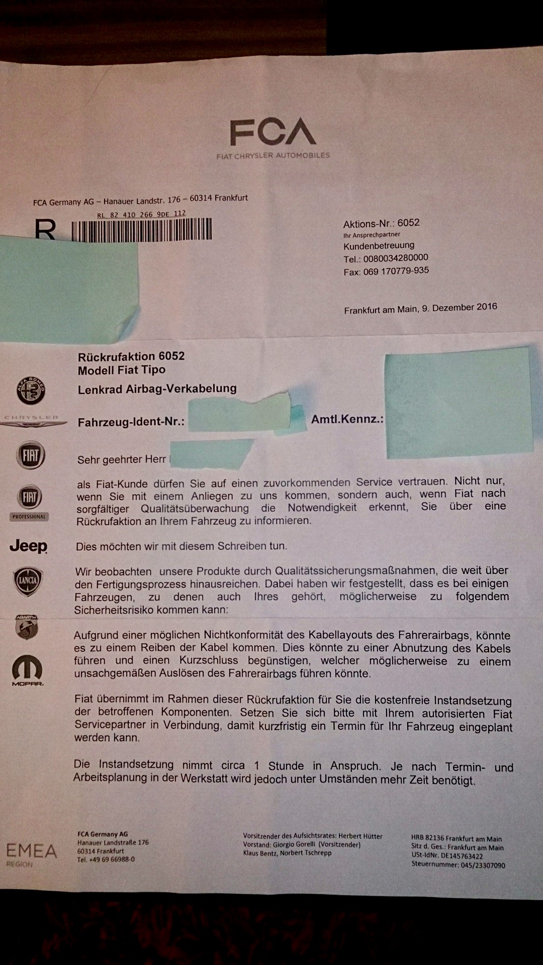 Samstag eine Benachrichtigung bekommen, dass ich ein Einschreiben zugestellt bekommen sollte. War nicht zuhause. Gestern das Einschreiben, nach 30minütiger Wartezeit in der Schlange bei der Post entgegengenommen. War von FCA. Rückrufaktion 6052 (Airbag-Verkabelung). Sofort Werkstatt angerufen, hatte schon für Donnerstag einen Termin. Wollen die dann an dem Tag überprüfen. Der freundliche Herr vom Kundendienst sagte mir, dass ein neuer Airbag eingebaut wird, wenn etwas an der Verkabelung nicht stimmen sollte. Angeblich ist nicht jeder Tipo vom Mangel an der Verkabelung betroffen. Na, dann schauen wir mal. Bin schon gespannt.