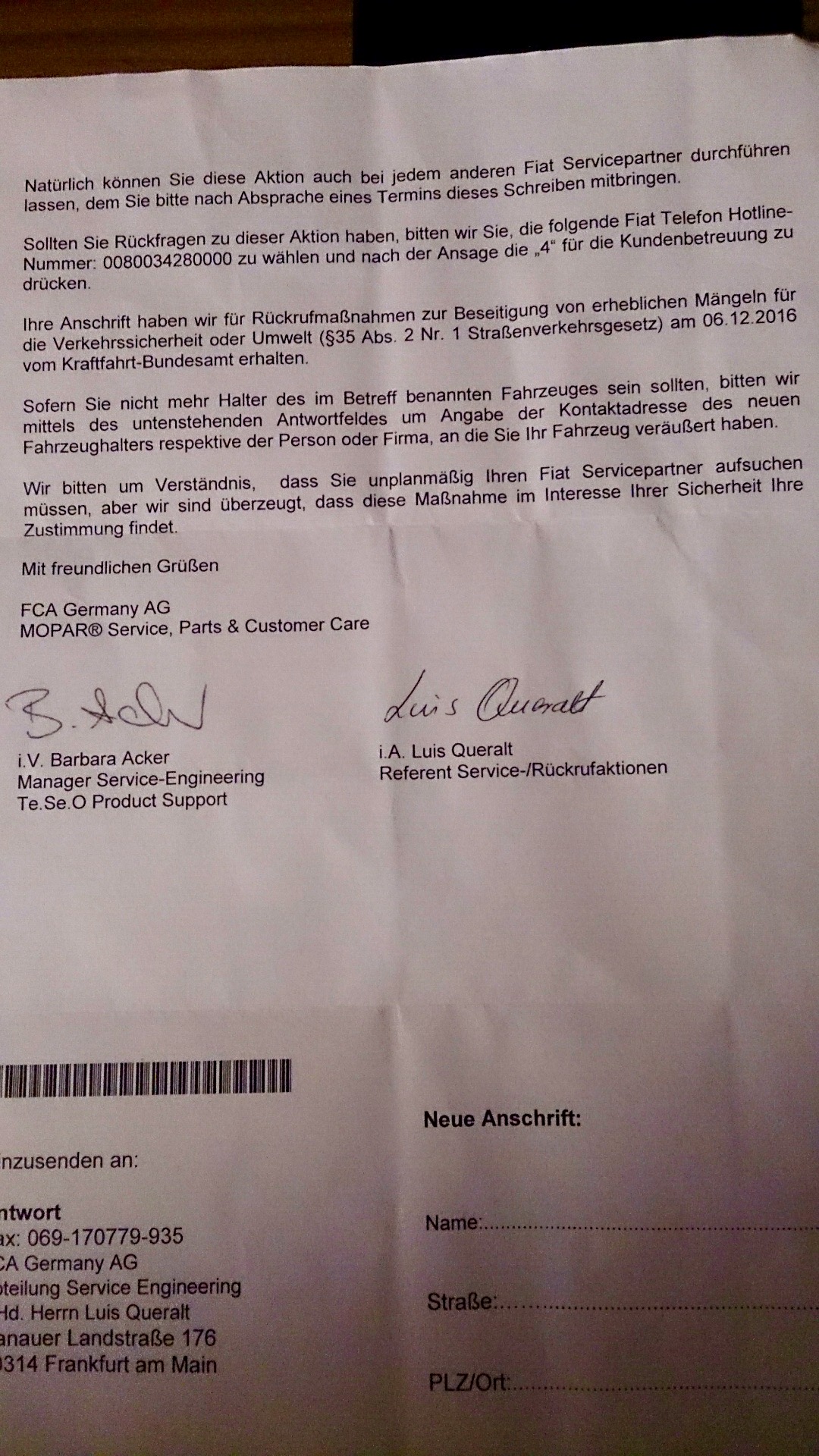 Hier mal das dazugehörige FCA Schreiben. Dafür stand ich heute 30 Minuten in der Postschlange!! Oh schöne Weihnachtszeit. Und mein Fahrzeug war schon in der Werkstatt deswegen, und muss noch mal hin wegen fehlender Teile....