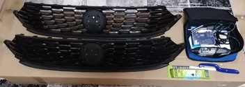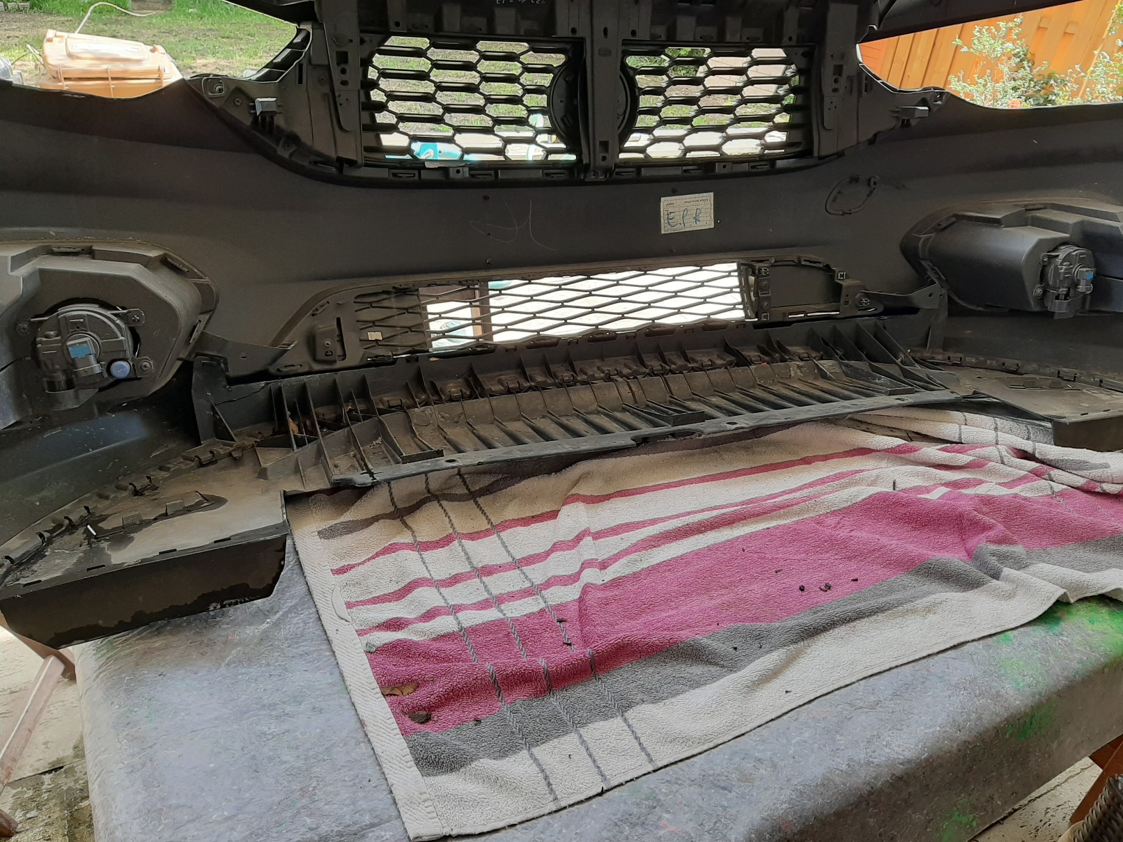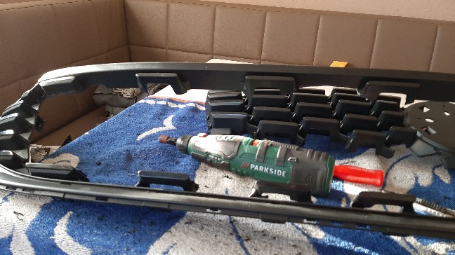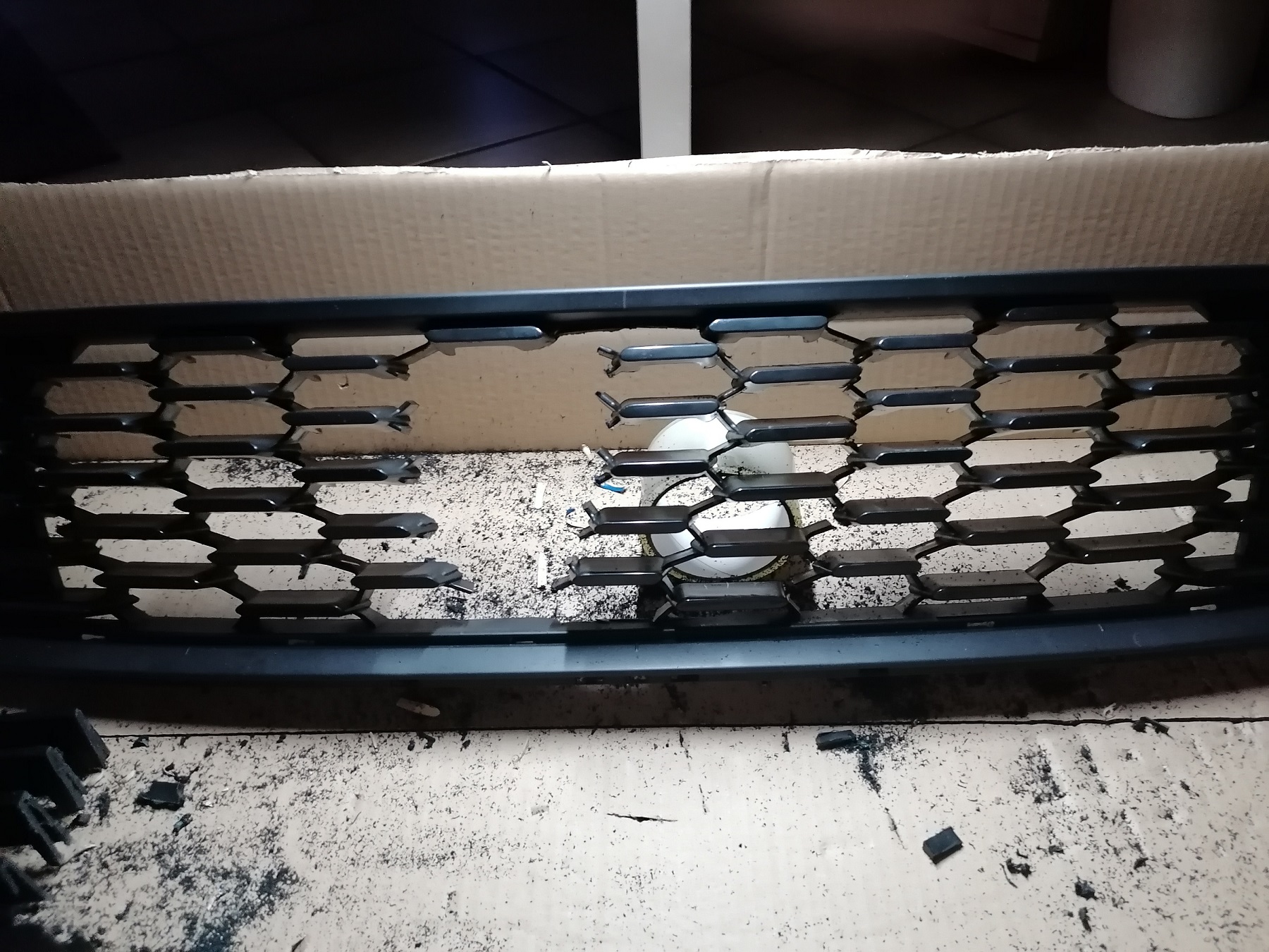 Das stimmt. Und selbst wenn man die Frontschürze abgebaut hat, ist es knifflig den Grill herauszubekommen, weil er geclipst ist und die Clipse größtenteils von einer verklebten Verstärkung auf der Rückseite der Frontschürze verdeckt werden. Diese Verstärkung hält hinter dem Grill den oberen und den unteren Teil der Frontschürze zusammen, sonst würde das obere Teil ohne Grill "in der Luft" hängen. -
