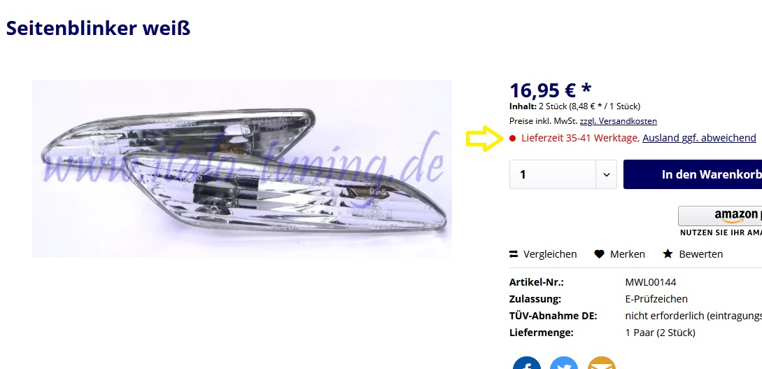 Würden mich auch reizen die LED Blinker. Aber 19 Euro Porto find ich krass. Und irgendwie fänd ich es optisch nicht so schön das nur die Seitenblinker LED sind und der rest standard Leuchtmittel sind