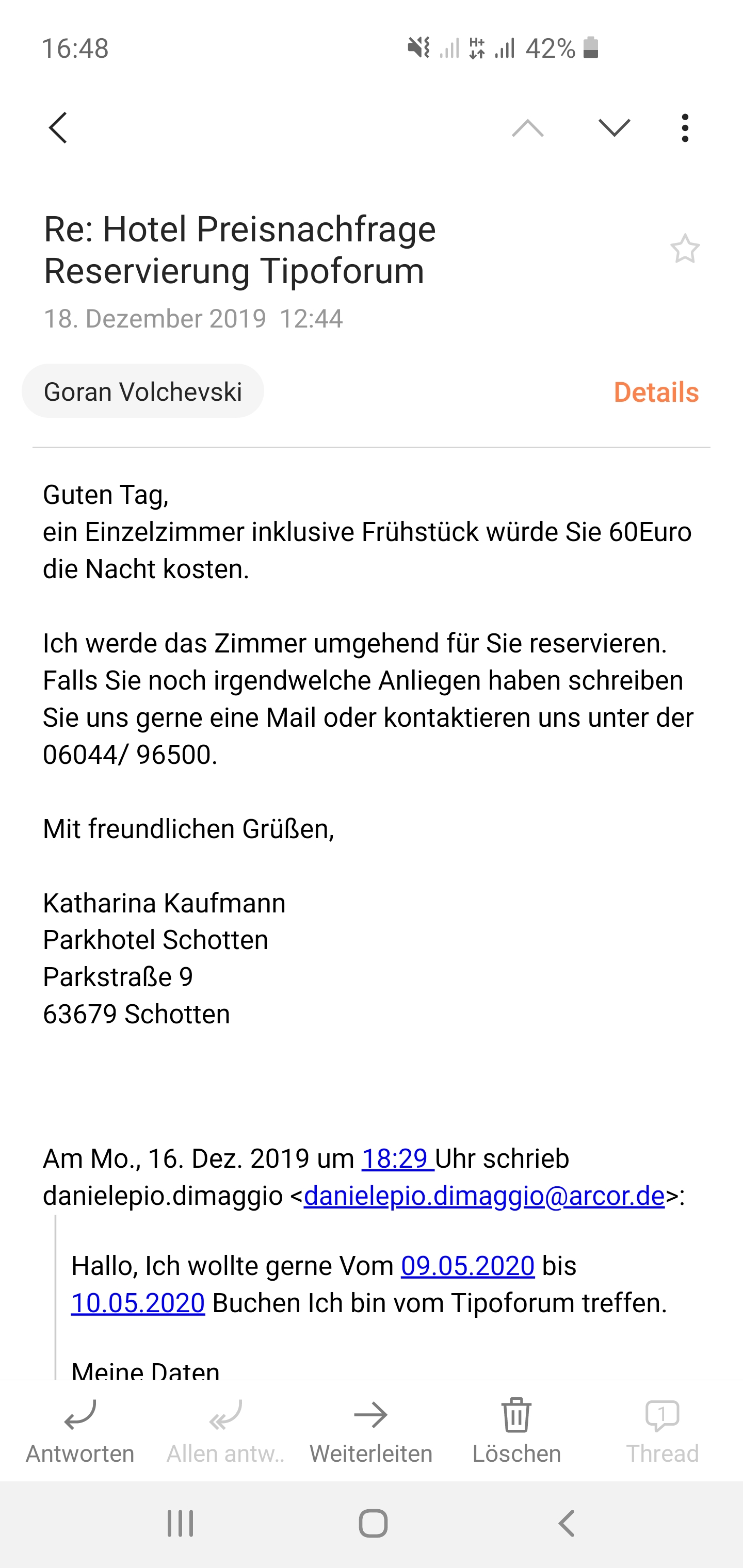 Ich werde das Zimmer umgehend für Sie reservieren. Fall Sie noch irgendetwas an Ihrer Buchung änder wollen rufen Sie uins gerne unter der (06044) 96500 an oder schreiben uns eine E-Mail.