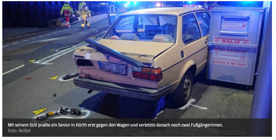 Der abgebildete Wagen ist der, der gerammt wurde. steht auch da, Zitat "den Wagen". Der SUV des Seniors ist ein schwarzer Audi, den man auf den anderen Bildern sieht. Wie andere auch bin ich ebenfalls für Wiederholungsprüfungen. Aber genereel für alle. Ich kenne viele im Freundeskreis, die meiner Meinung nach nicht hinters Steuer gehören ... ne Bekannte hatte schon mehrere Unfälle in ihren ersten Monaten und fährt immer noch katastrophal. Nur so als Beispiel -