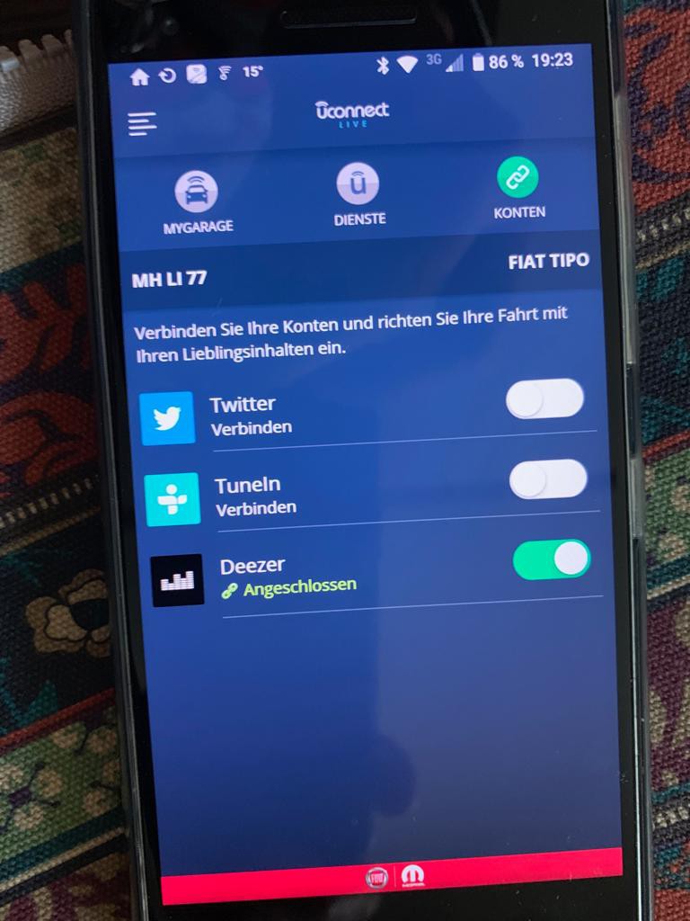 Hallo, wie geht das, das ich Uconnect mit der facebookapp kopple. Das taucht bei mir nicht auf. Wieso nicht? Nur Twitter, Tunneln und deezer.