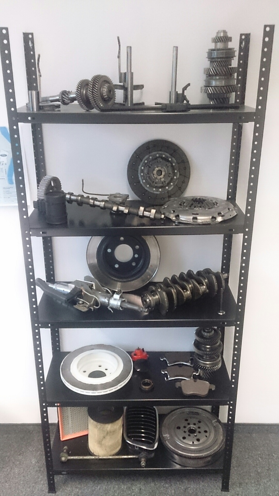 Ihr seid ja alle Auto-Enthusiasten und habt Benzin im Blut. Und ich darf als Berater im Automotive Aftersales Business auch "hautnah" am Markt sein. Was haltet Ihr von meiner privaten Teilesammlung, im Büro schön angeordnet. Das fing im letzten Jahr mit den Bremsscheiben meines Vaters an, die ich nach einer Inspektion bei BMW mir gerne mal anschauen wollte und hat sich dann fortgesetzt mit den Problemen meines Opel Astra H, Bj. 2009, mit MR32 Getriebe, dass sich im Dezember 2015 in Einzelteile zerlegt hat, dazu Kupplungssatz, Zweimassenschwungrad, Luftmassenmesser, verglaste Bremsklötze, kaputte Hupe etc..