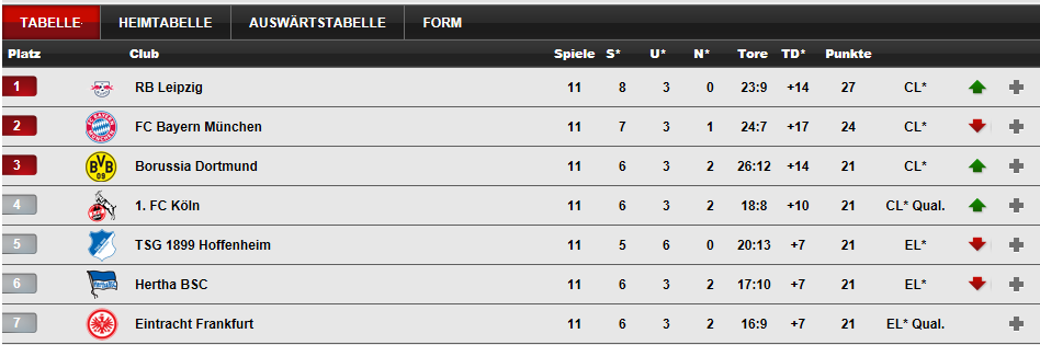 Leipzig hat 27 Punkte, 3 Punkte Vorsprung vor den Bayern.