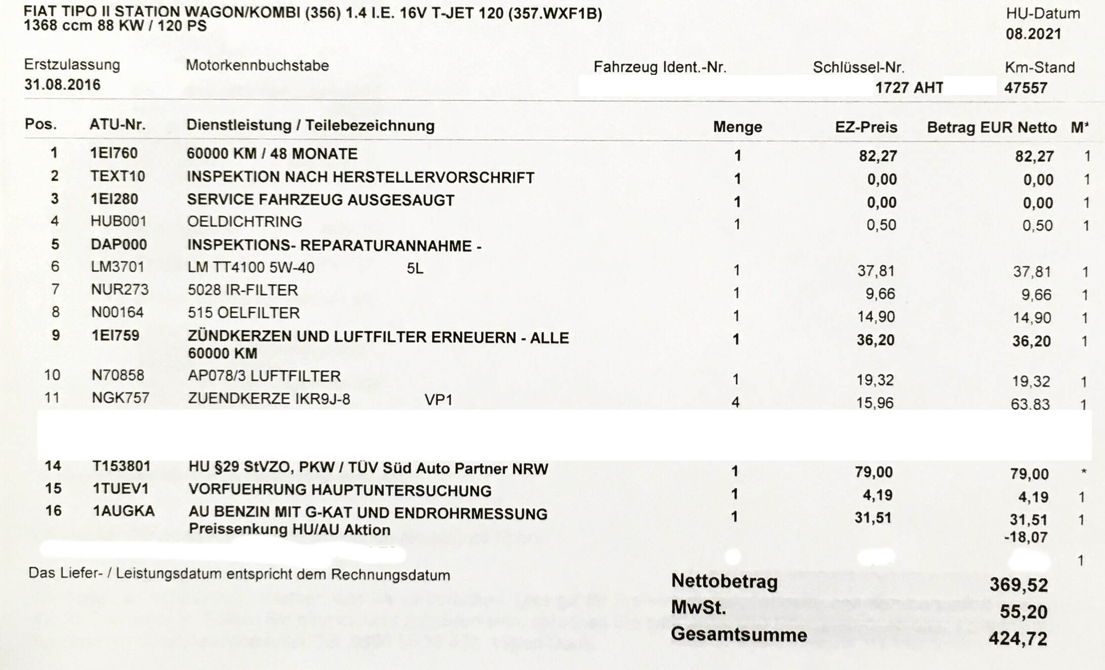Anbei die Rechnung. Die Zündkerzen wurden bei mir aber schon bei Inspektion Nr. 2 gewechselt...