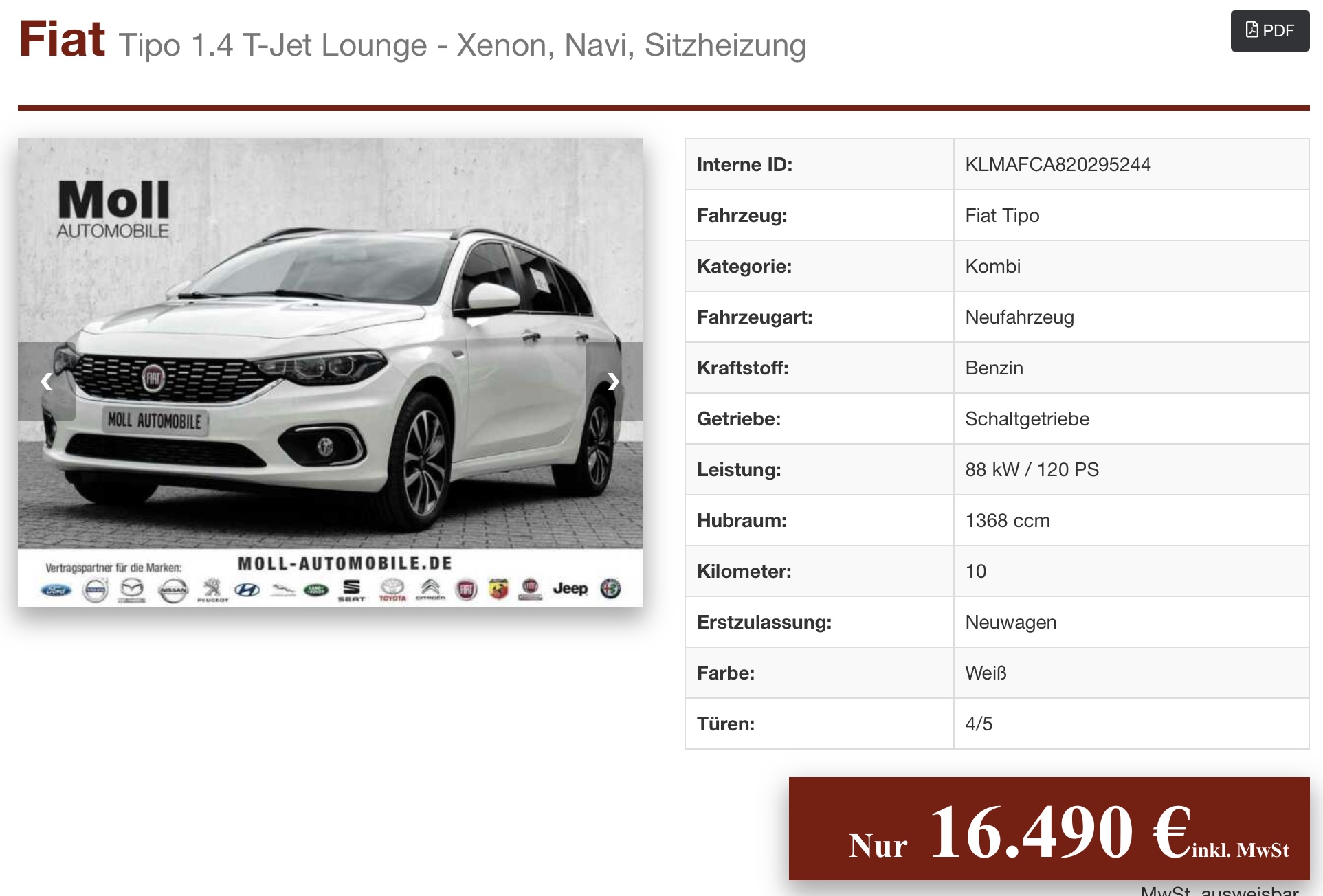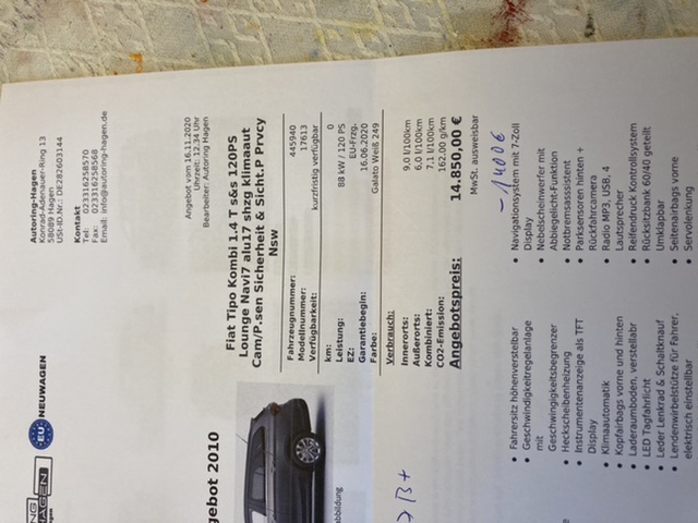 ich möchte mir ein Fiat Tipo Kombi als S - Design 1,4 mit 120 PS Benzinmotor als Tageszulassung kaufen auf was muss ich achten.