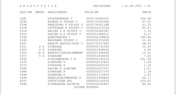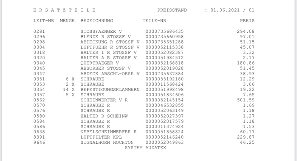 Stoßfänger, Scheinwerfer, Nebelscheinwerfer, Querträger, Luftfilterkasten, Hupe und diverse Kleinteile, Schrauben und Blenden müssen neu.
