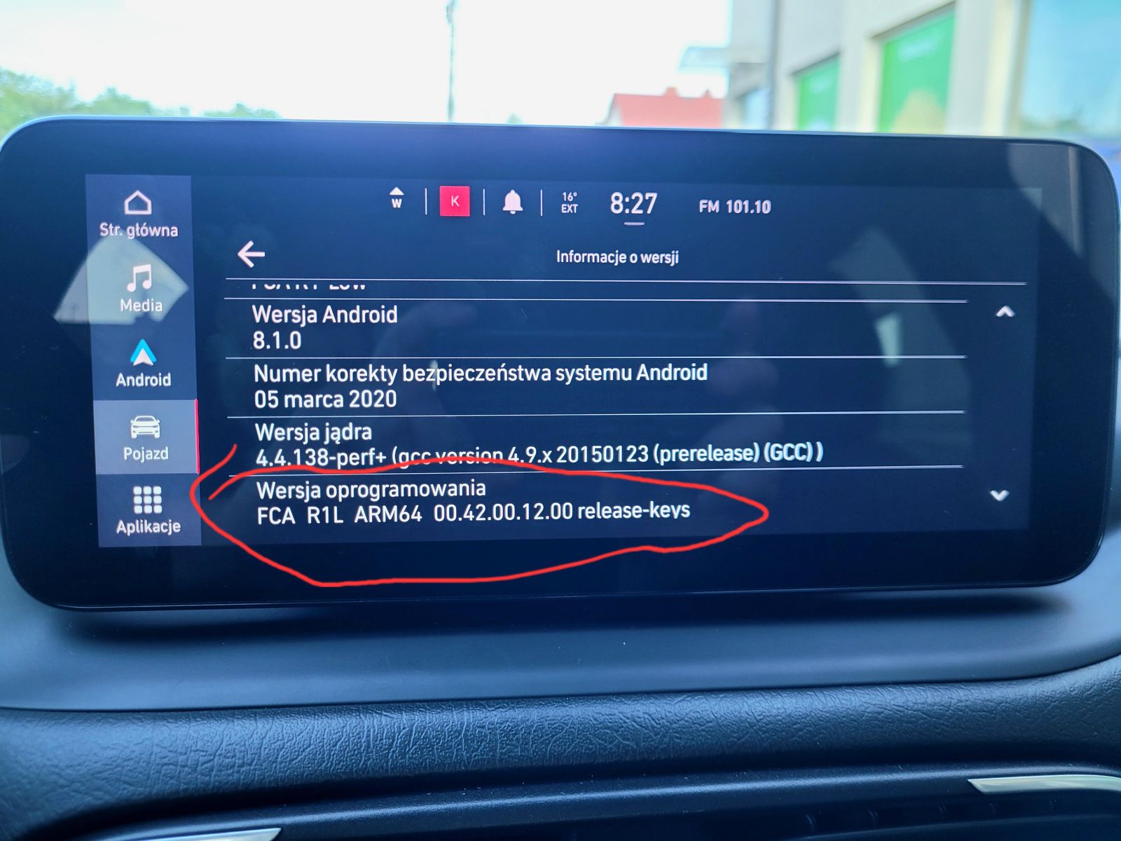 Mój problem został rozwiązany dopiero 8 września 2025 roku. Autoryzowany serwis Fiata zainstalował na moim tablecie najnowsze oprogramowanie FCA R1L ARM64 00.42.00.12.00 RELESE-KEYS. Wszystkie problemy z utratą ustawień, przygasającymi diodami LED i czujnikami parkowania zostały rozwiązane. Cały system jest bardziej stabilny, a połączenie bezprzewodowe z telefonami działa szybko i płynnie.