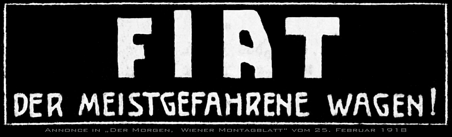 Als Historiker, der auf seinen weissen Typo S-Design wartet, habe ich mich ein wenig mit historischer Fiat-Werbung gespielt - jaja, wenn man wartet, kommt man auf solche Gedanken. Habe die alte 100-jährige Fiat-Werbung (erstaunlicherweise in einer Wiener-Zeitung erschienen, obwohl zwischen Österreich-Ungarn und Italien Krieg herrschte) ein wenig beim Fernsehschauen bearbeitet, da gabs heute einen wunderbaren alten Film aus 1963, und trage mich mit dem Gedanken, mir das als wetterfesten Kleber für den Tipo drucken zu lassen. Wie seht Ihr das? Ist die Quellenangabe "Der Morgen..." überflüssig, ist das überhaupt aus der Zeit gefallen? Copyrights gibt es übrigens keine, da die Annonce vor mehr als 70 Jahren erschienen ist... Eine knallige Version mit roter Schrift auf schwarzem Grund habe ich auch schon erstellt, passt zwar zu Fiat, aber weniger zum S-Design.