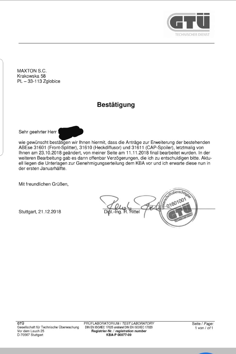 Man kann die ABE kaufen für 25 €https://maxtondesign.de/Maxton…-RD1-RS1-AUDI-BMW-VW-FORD