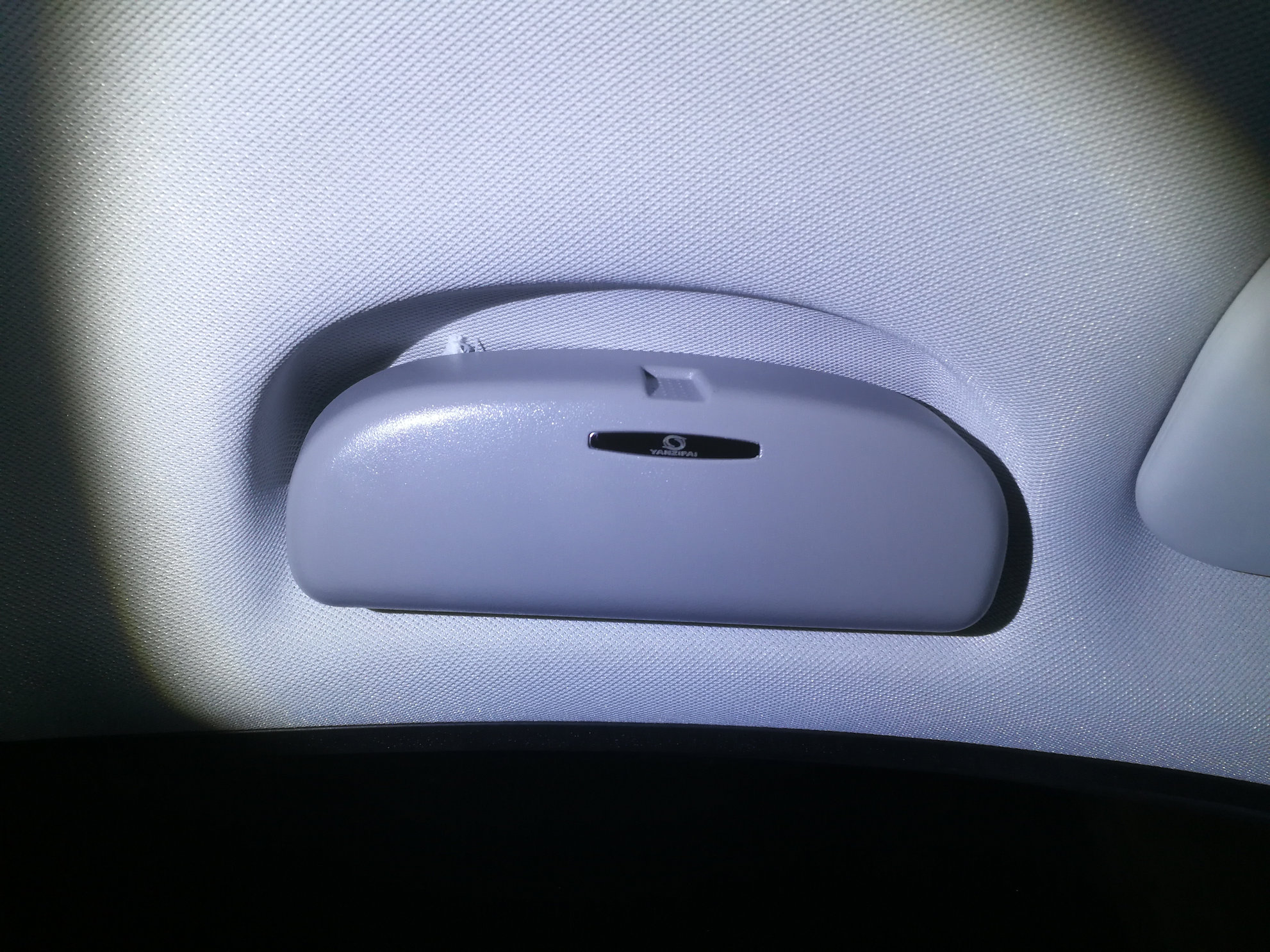 Das Brillenfach ist innen gummiert und wie zu sehen sind oben über den Halterungen ganz schmale Schlitze zu sehen, ca 1 mm. Da ist die Aussparrung original zu groß. Sieht man aber nur wenn heruntergeklappt ist.