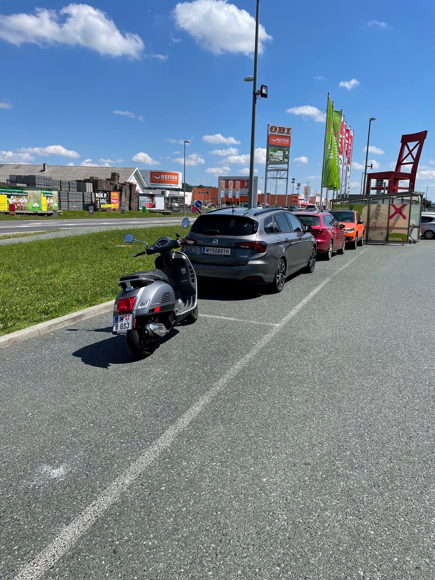 Am Wochenende einkaufen gewesen im Südburgenland und eine schöne Vespa hinter mir entdeckt. Schöne Kombi