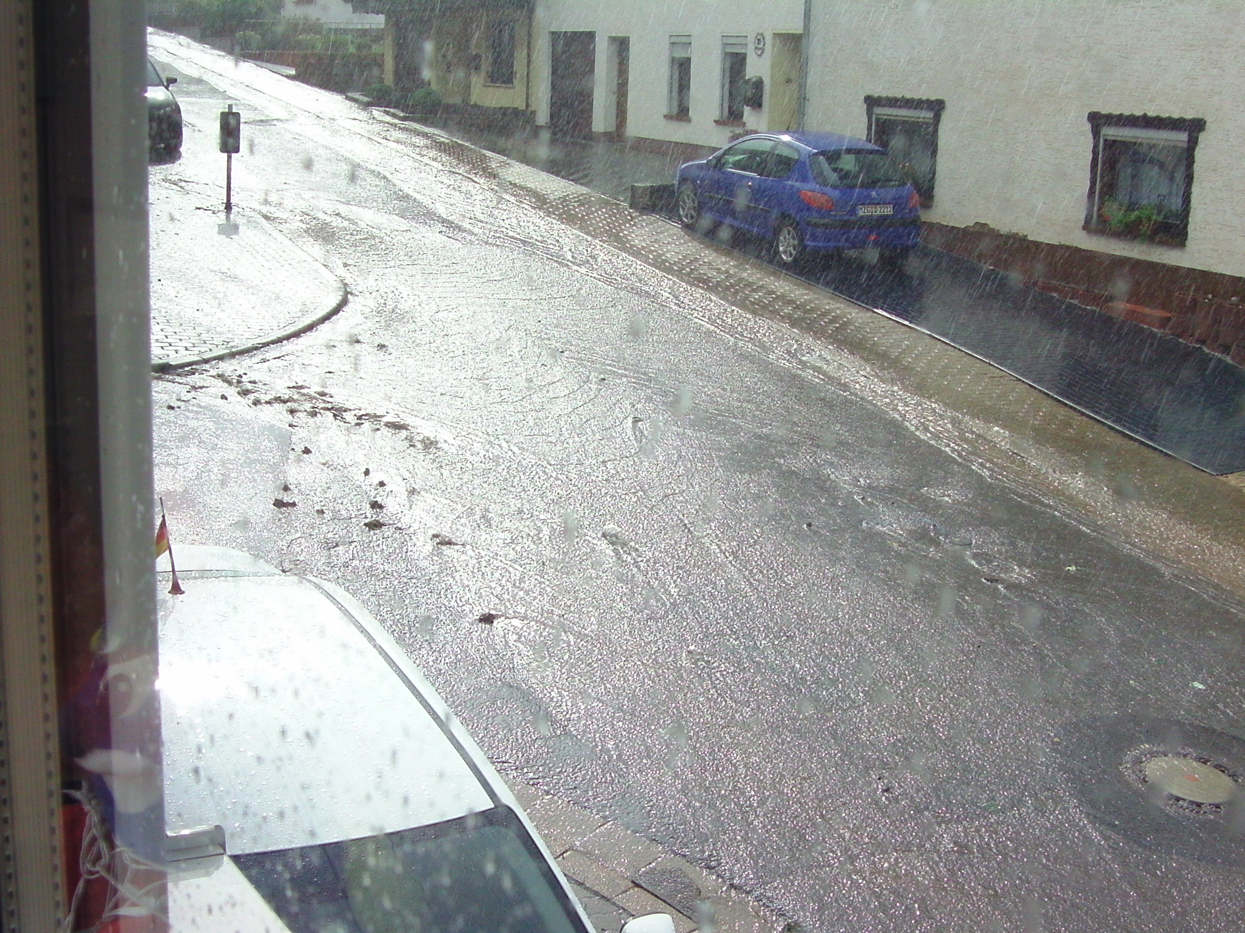So hat´s heute gegen 16.30 Uhr ausgesehen. Da war der stärkste Hagel schon vorbei...oberhalb von uns hat´s die Kanaldeckel samt Schmutzkorb aus den Strassen gehoben...