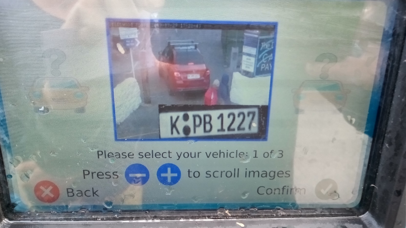 Das Bild zeigt einen Parkautomaten. Eine Kamera nimmt jeden Einfahrenden von hinten auf. Den Voucher vom Pub unter den Scanner gehalten, die ersten 3 Buchstaben vom Kennzeichen eingegeben, Bild kommt, O.k. drücken und rausfahren.