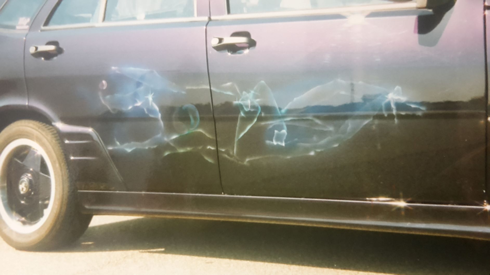 • Dem Bild auf der Motorhaube habe ich den Titel " Gestrandet in Raum und Zeit" gegebben. Die Seiten zeigen